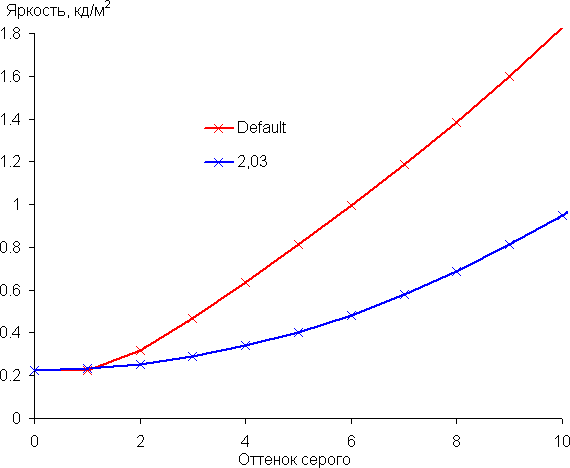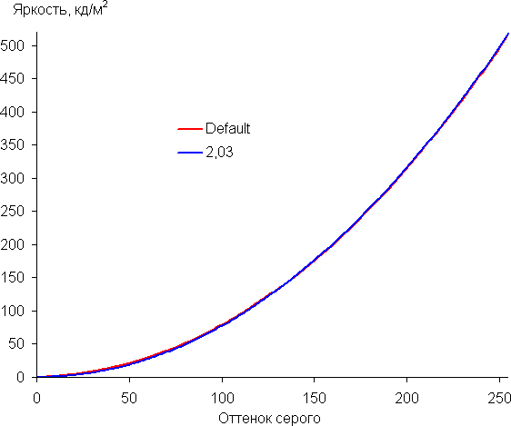 Рост прироста яркости более-менее равномерный, и почти каждый следующий оттенок ярче предыдущего. Только в тенях ближайший к черному оттенок серого визуально не отличается по яркости от черного. Далее с ростом яркости все оттенки в тенях хорошо различаются, что может быть полезным в случае игр, но, например, при просмотре кино это будет подчеркивать артефакты сжатия в тенях: