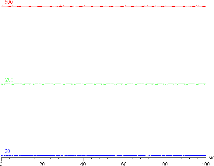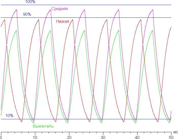Яркость монитора меняется именно яркостью подсветки, то есть без ущерба для качества изображения (сохраняется контрастность и количество различимых градаций) яркость монитора можно менять в очень широких пределах, что позволяет с комфортом играть, работать или смотреть фильмы как в освещенном, так и в темном помещении. На любом уровне яркости модуляция подсветки отсутствует, что исключает видимое мерцание экрана. Для тех, кто привык распознавать знакомое сокращение, уточним: ШИМ отсутствует. В доказательство приведем графики зависимости яркости (вертикальная ось) от времени (горизонтальная ось) при различных значениях настройки яркости: