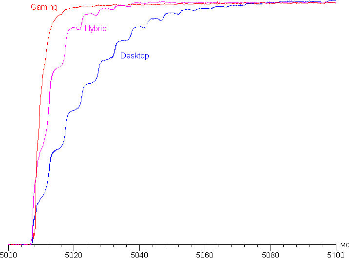 По мере увеличения разгона на графиках некоторых переходов появляются характерные всплески яркости — например, так выглядят графики для перехода между оттенками 40% и 60% (значения настройки Разгон приведены над графиками):