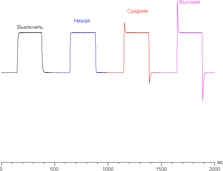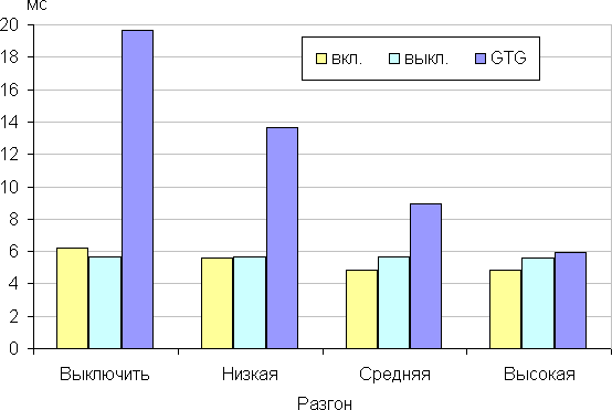 Время отклика зависит от значения настройки Разгон, которая управляет разгоном матрицы. График ниже показывает, как меняется время включения и выключения при переходе черный-белый-черный (столбики «вкл.» и «выкл.»), а также среднее суммарное время для переходов между полутонами (столбики «GTG») для четырех значений этой настройки: