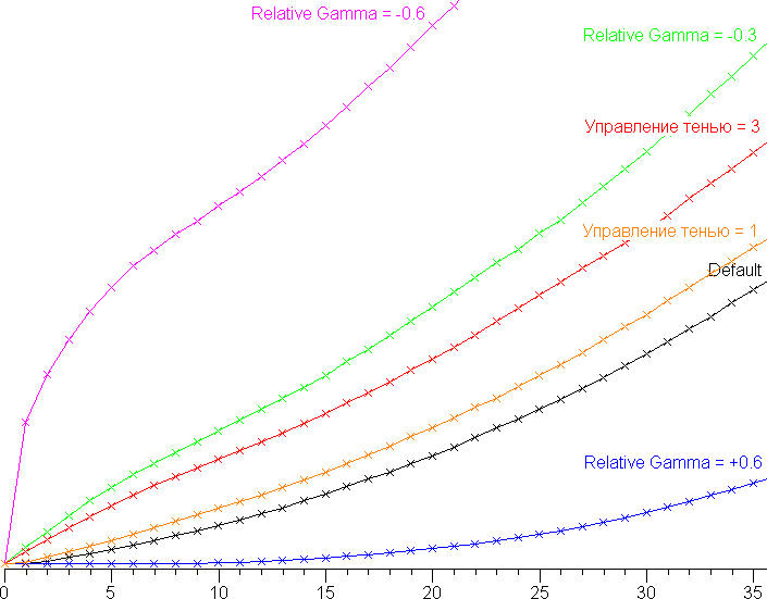 Различимость градаций в тенях можно немного повысить, увеличив значение настройки Управление тенью. Также различимость темных оттенков возрастает с уменьшением параметра Relative Gamma (завал в тенях на один оттенок пропадает), и снижается с его увеличением (и завал в тенях увеличивается).