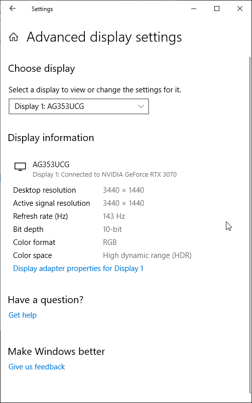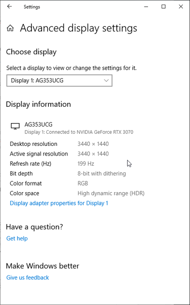 При подключении к компьютеру по DisplayPort и по HDMI поддерживалось разрешение до 3440×1440 при 200 Гц и 100 Гц кадровой частоты, соответственно, на вход, и вывод изображения на экран также осуществлялся с этими частотами. При этом поддерживается 8-ми битное представление цвета, а если снизить частоту до 144 Гц, то по DisplayPort передается уже 10-бит на цвет.