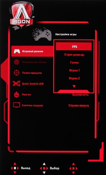 Из дополнительных возможностей присутствуют две «геймерские» функции: вывод в центре экрана прицела и счетчика частоты кадров в одном из углов. Счетчик работает только в режиме G-Sync и только при подключении по DisplayPort.
