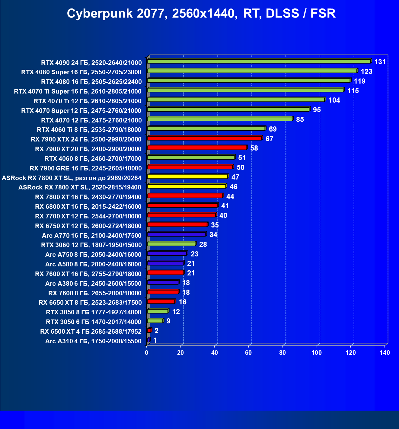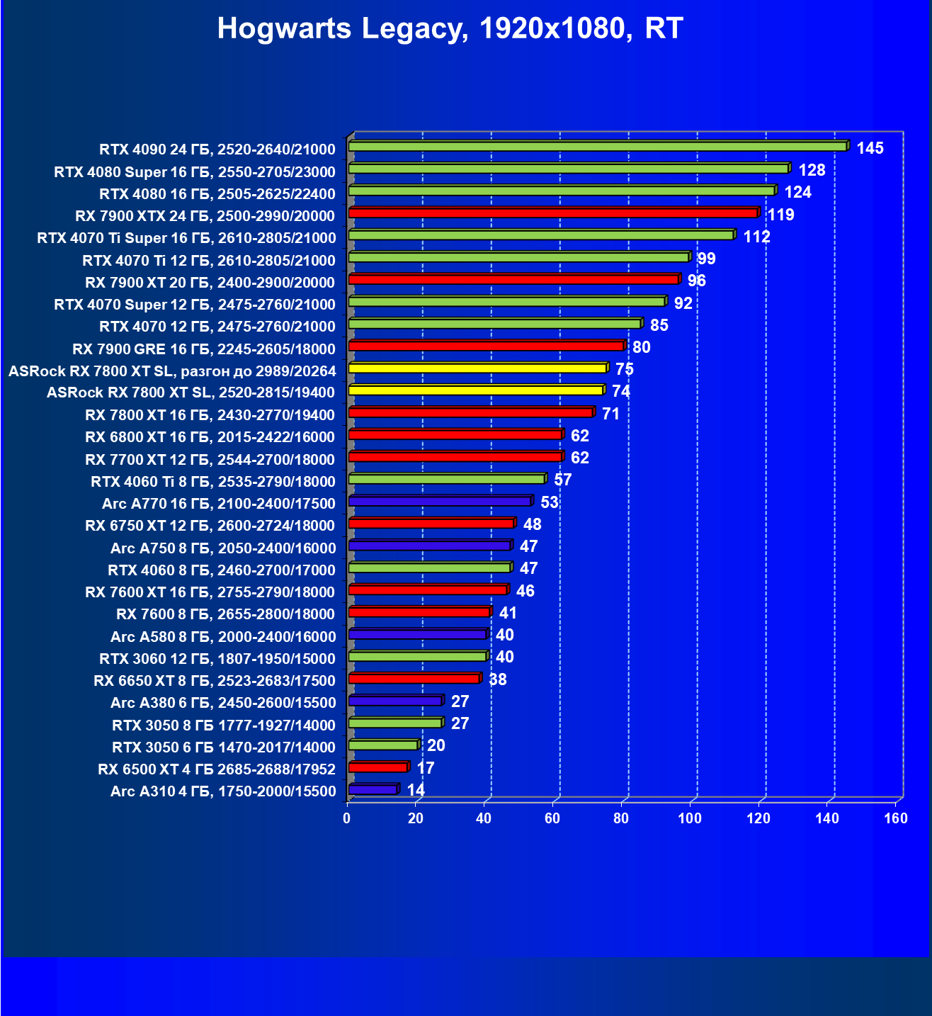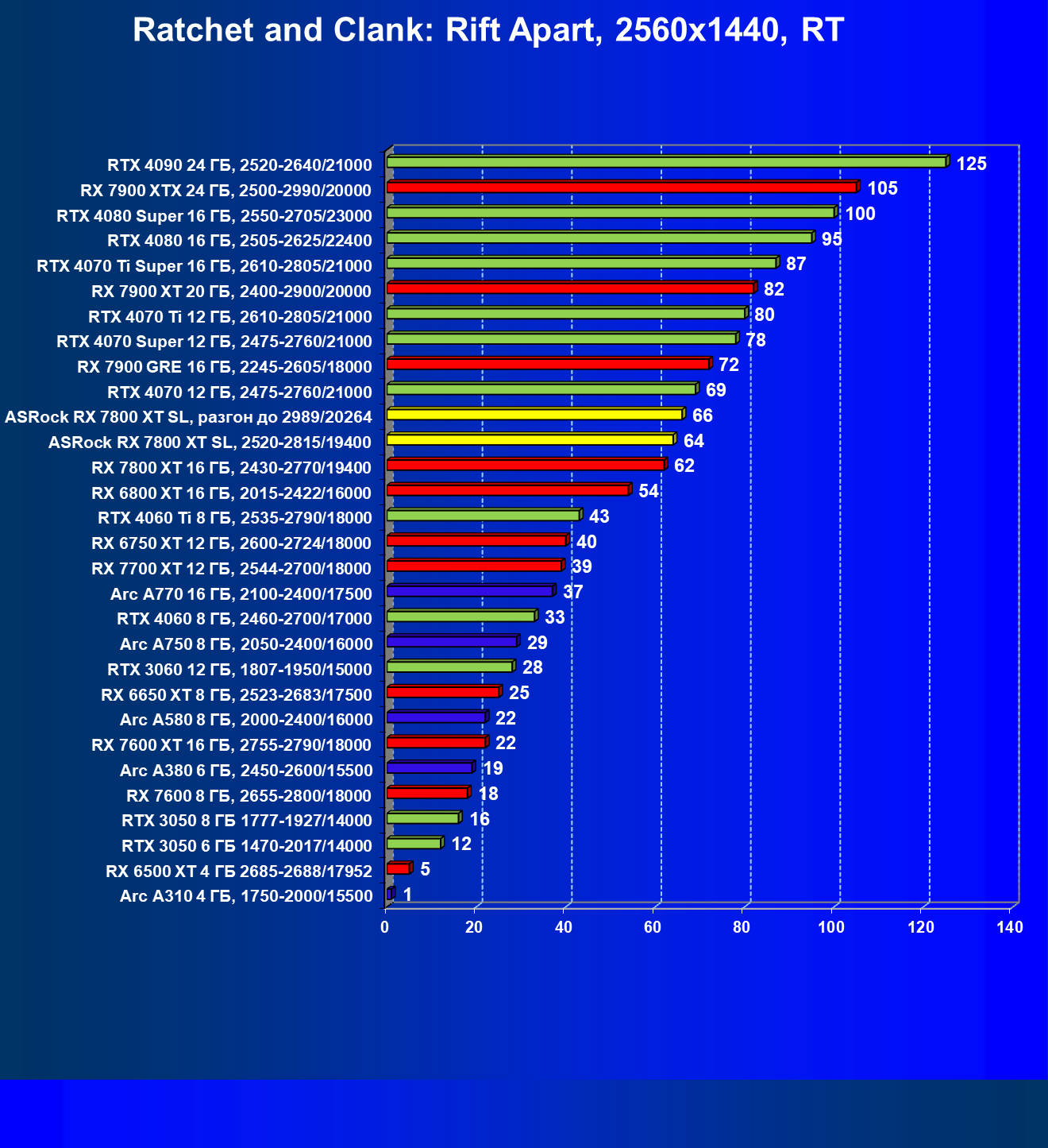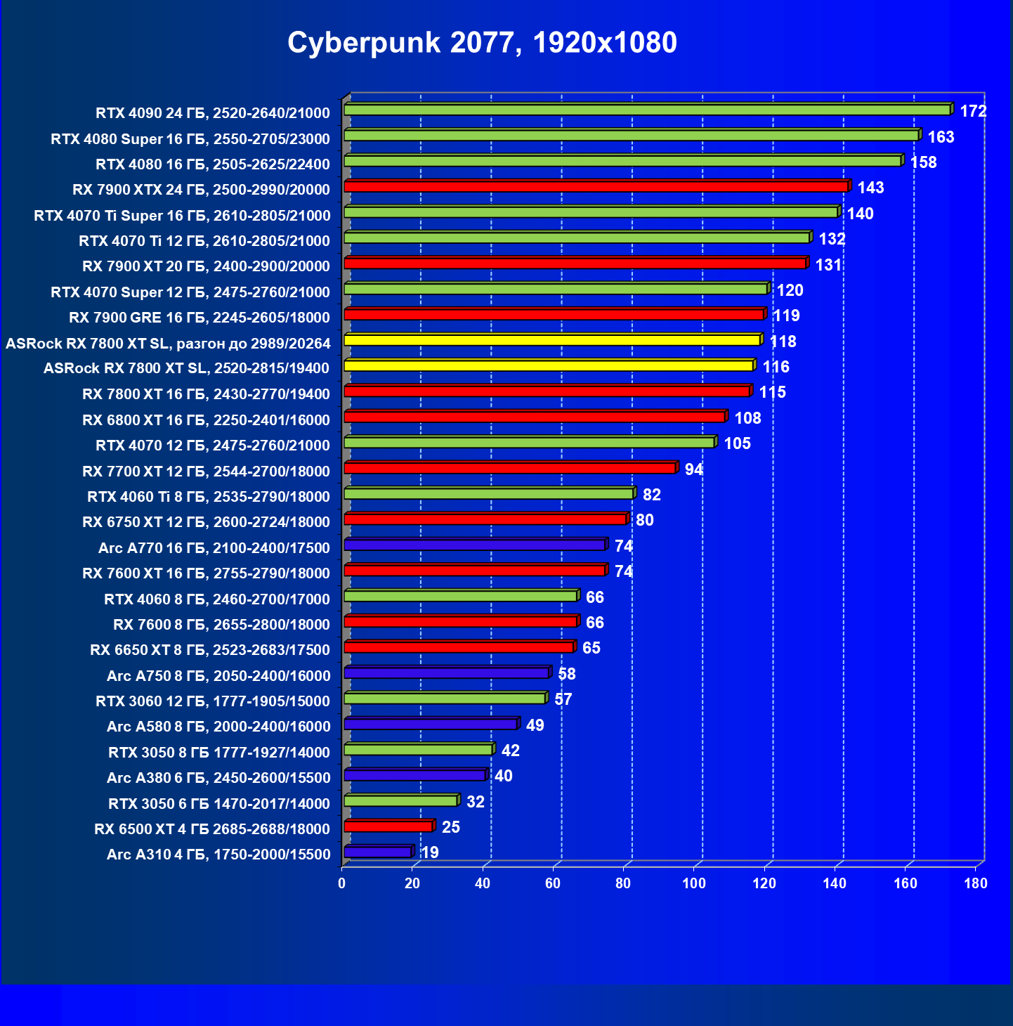 | 14 | RX 7800 XT 16 ГБ, 2430—2770/19400 | 1662 | 302 | 55 000 |