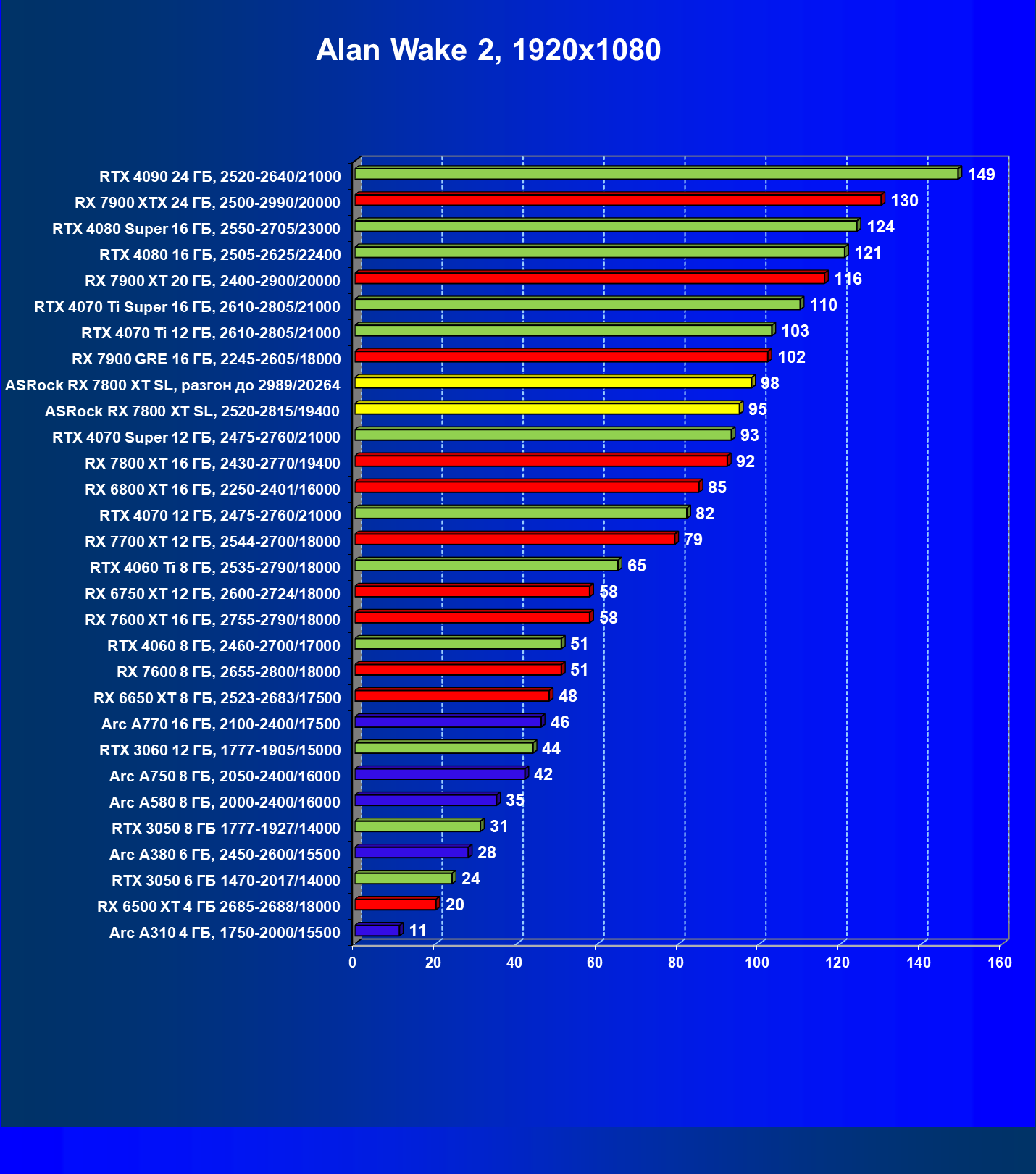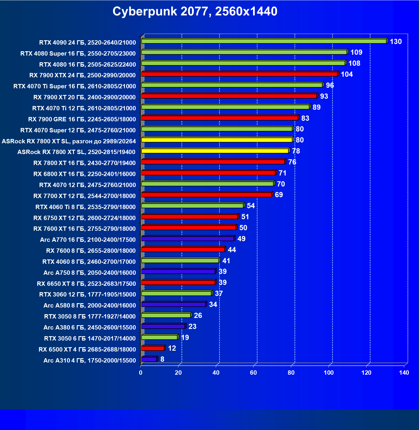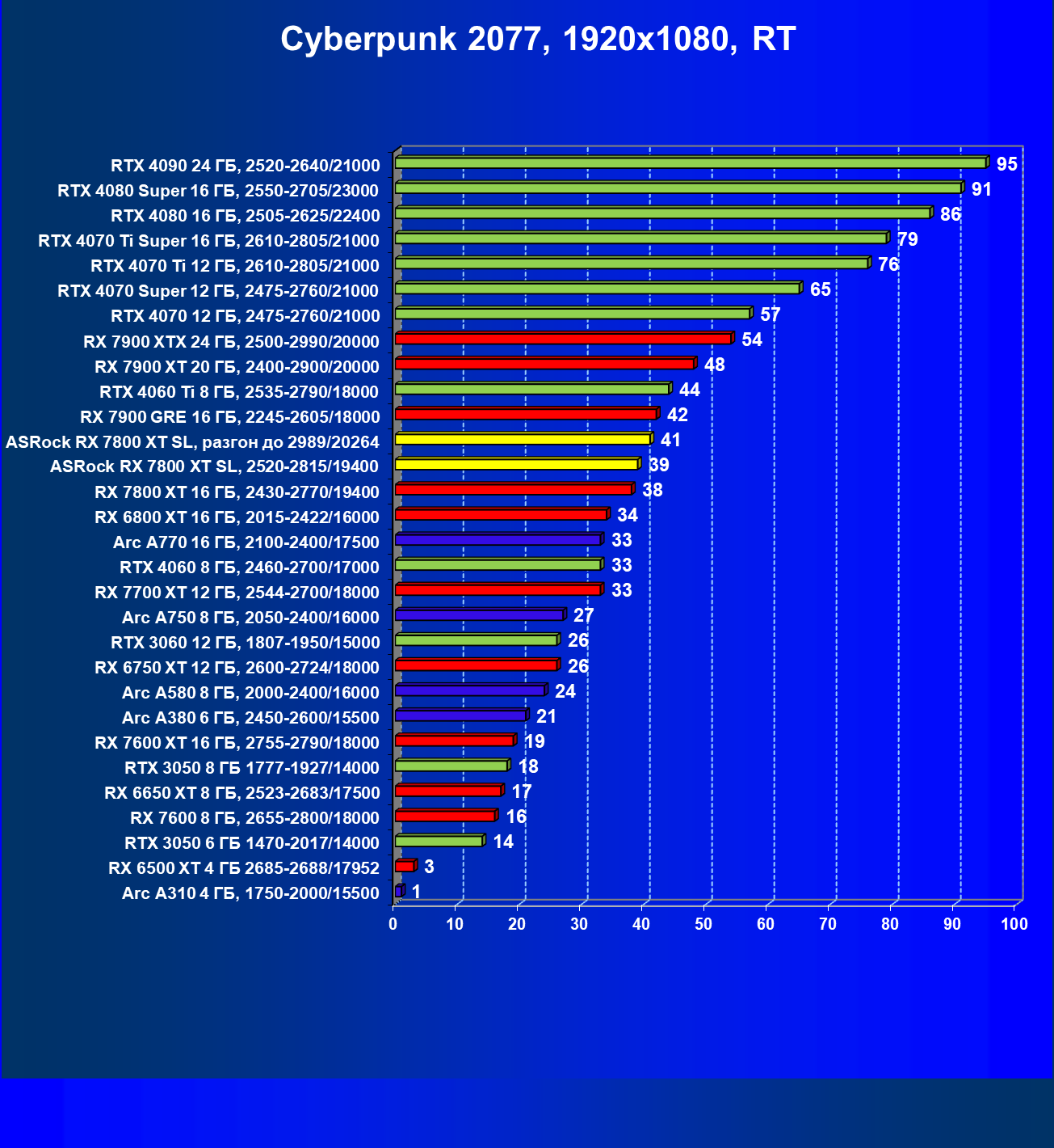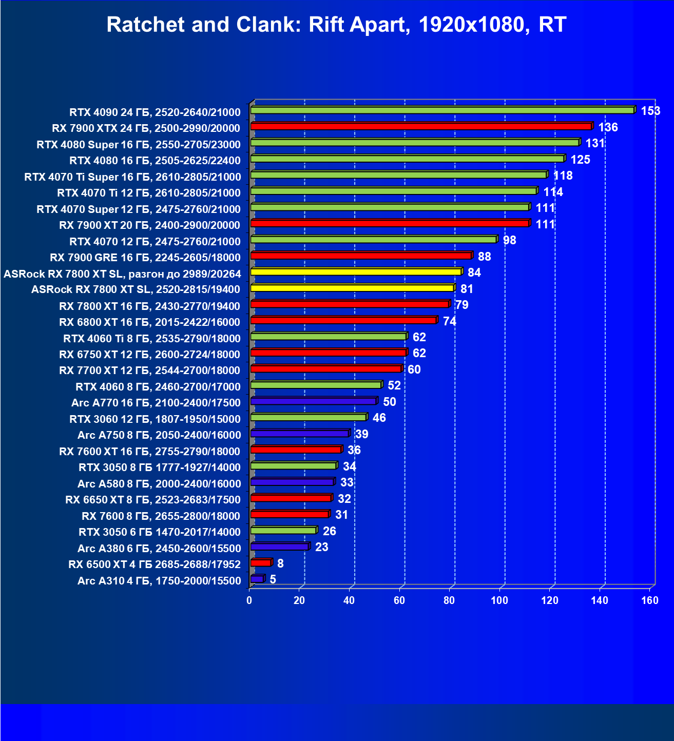 | 14 | RX 7800 XT 16 ГБ, 2430—2770/19400 | 1662 | 302 | 55 000 |
