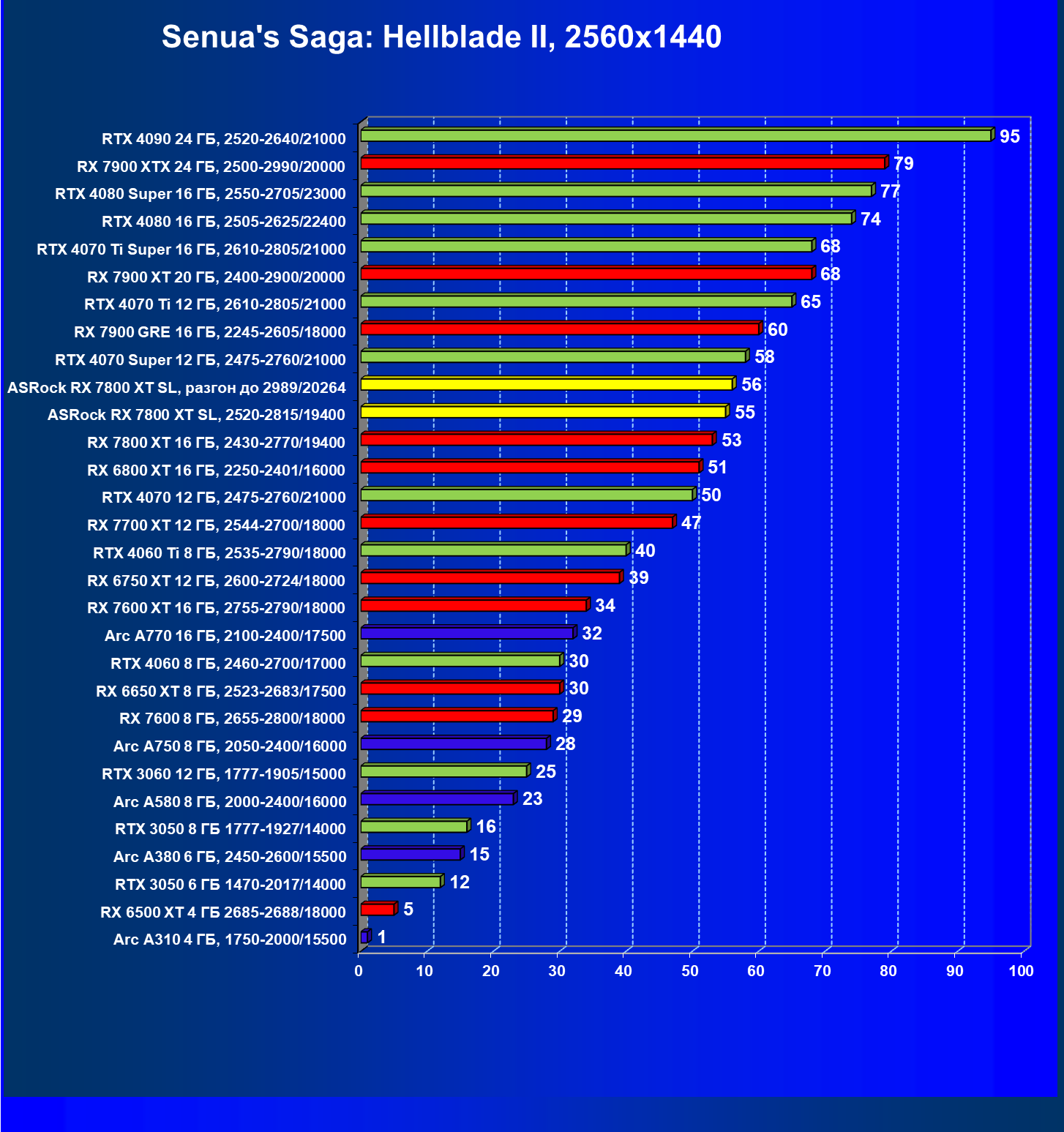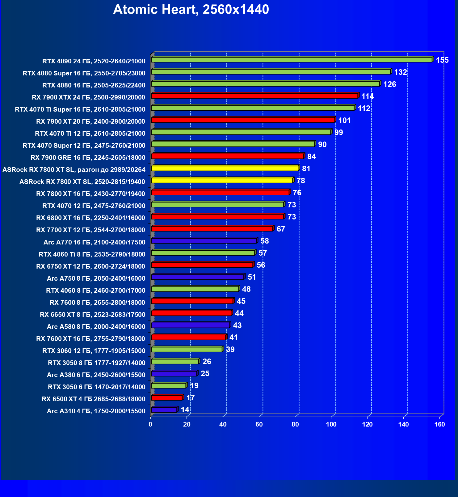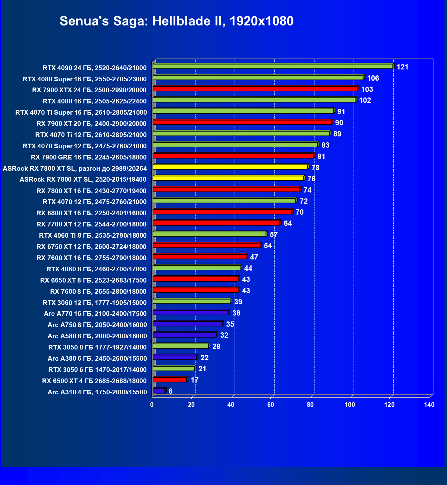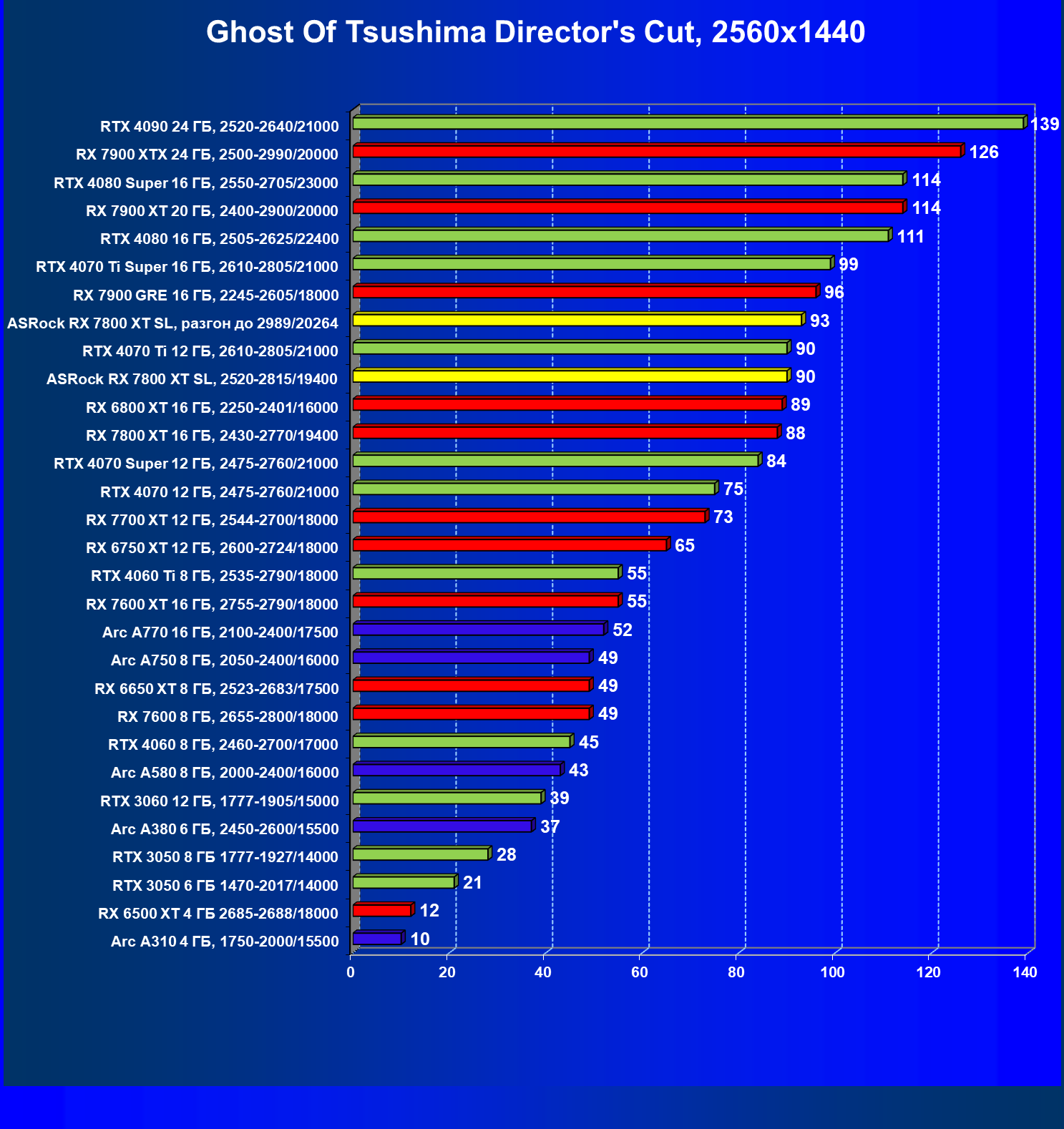 | 14 | RX 7800 XT 16 ГБ, 2430—2770/19400 | 1662 | 302 | 55 000 |