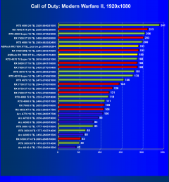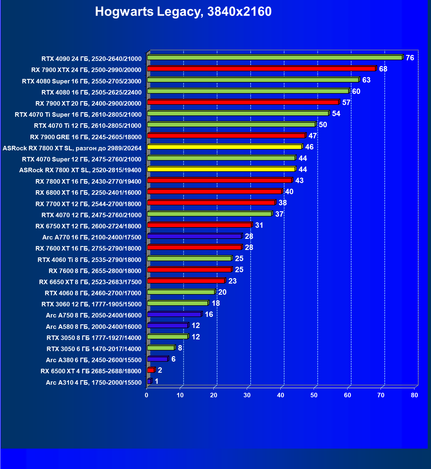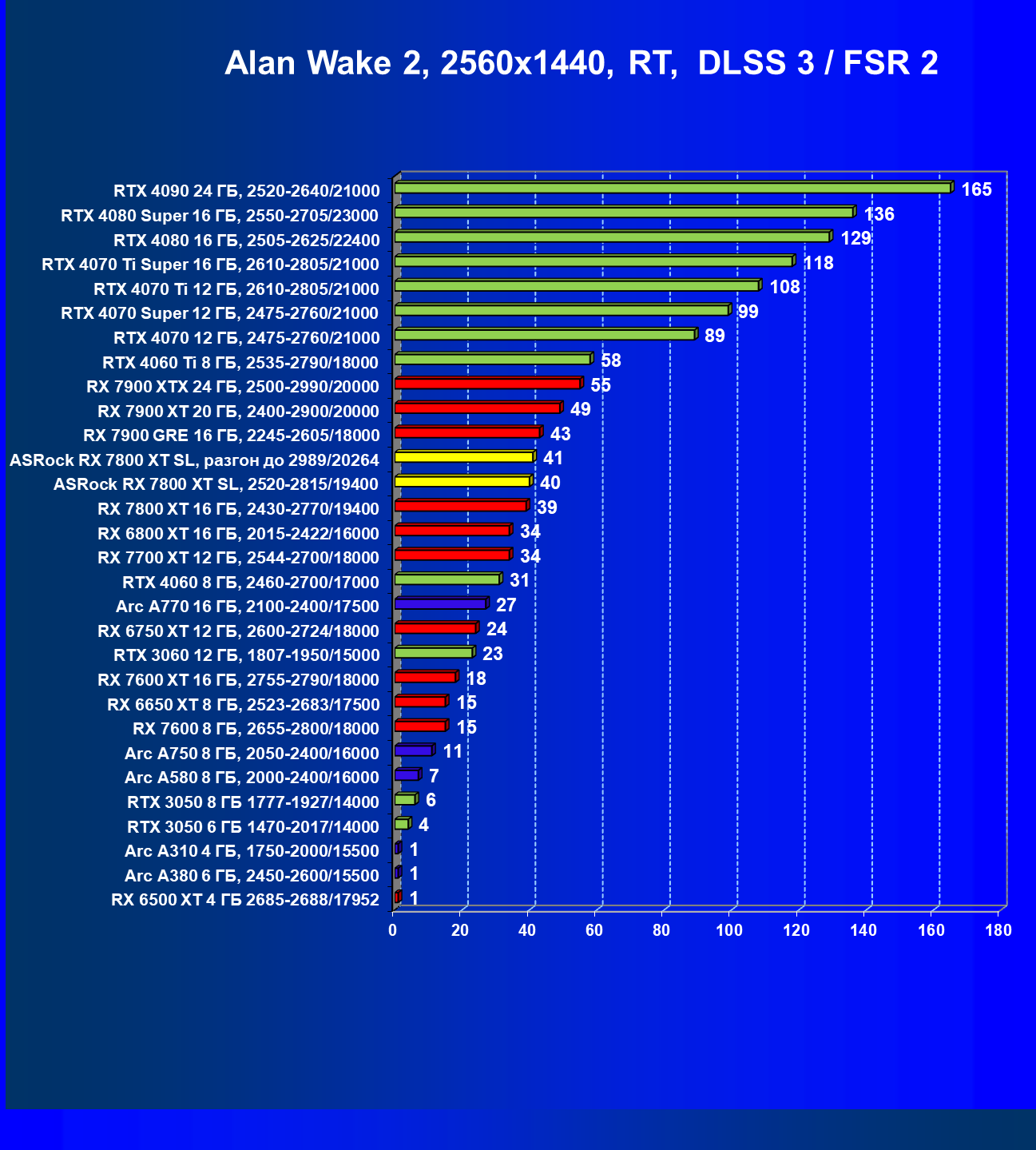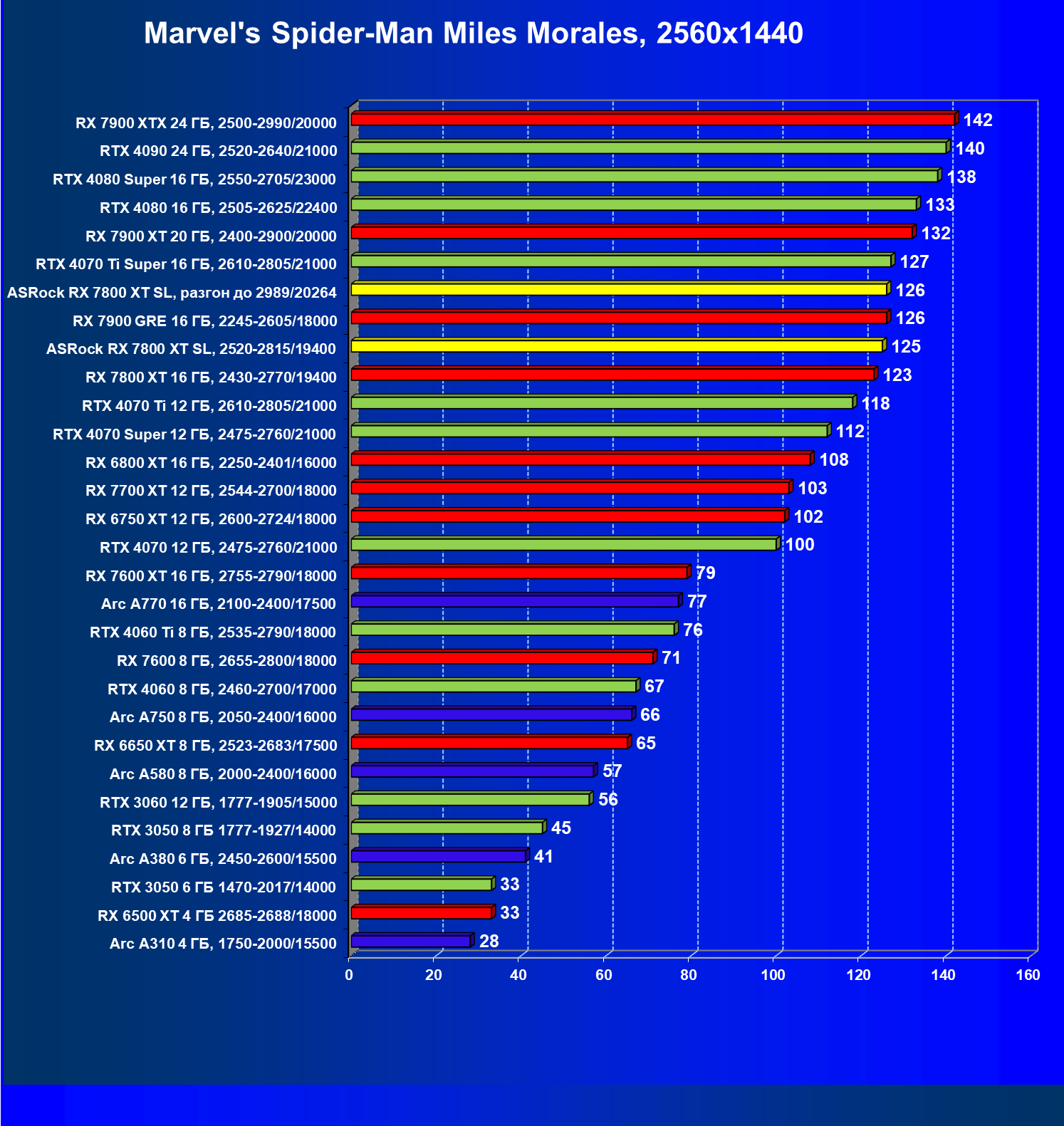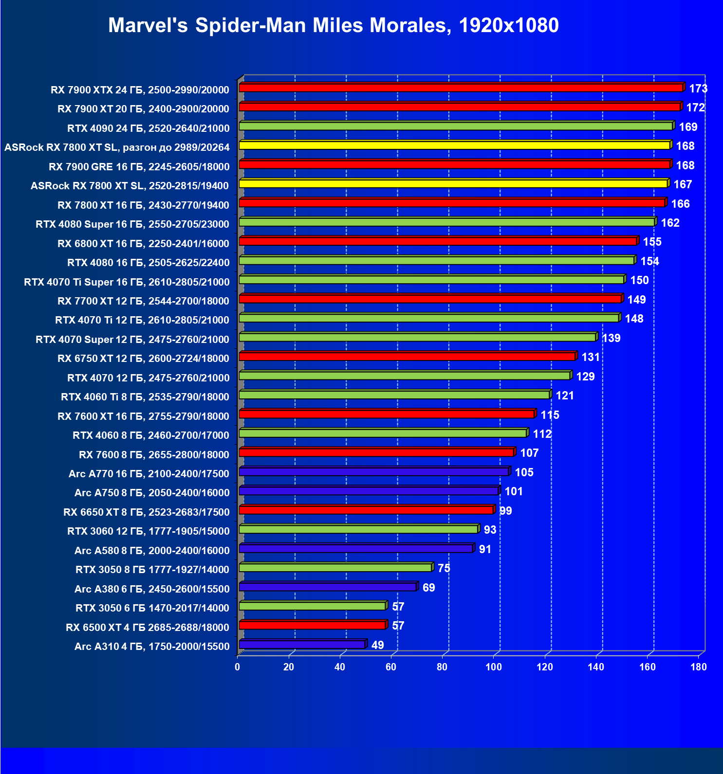 | 14 | RX 7800 XT 16 ГБ, 2430—2770/19400 | 1662 | 302 | 55 000 |