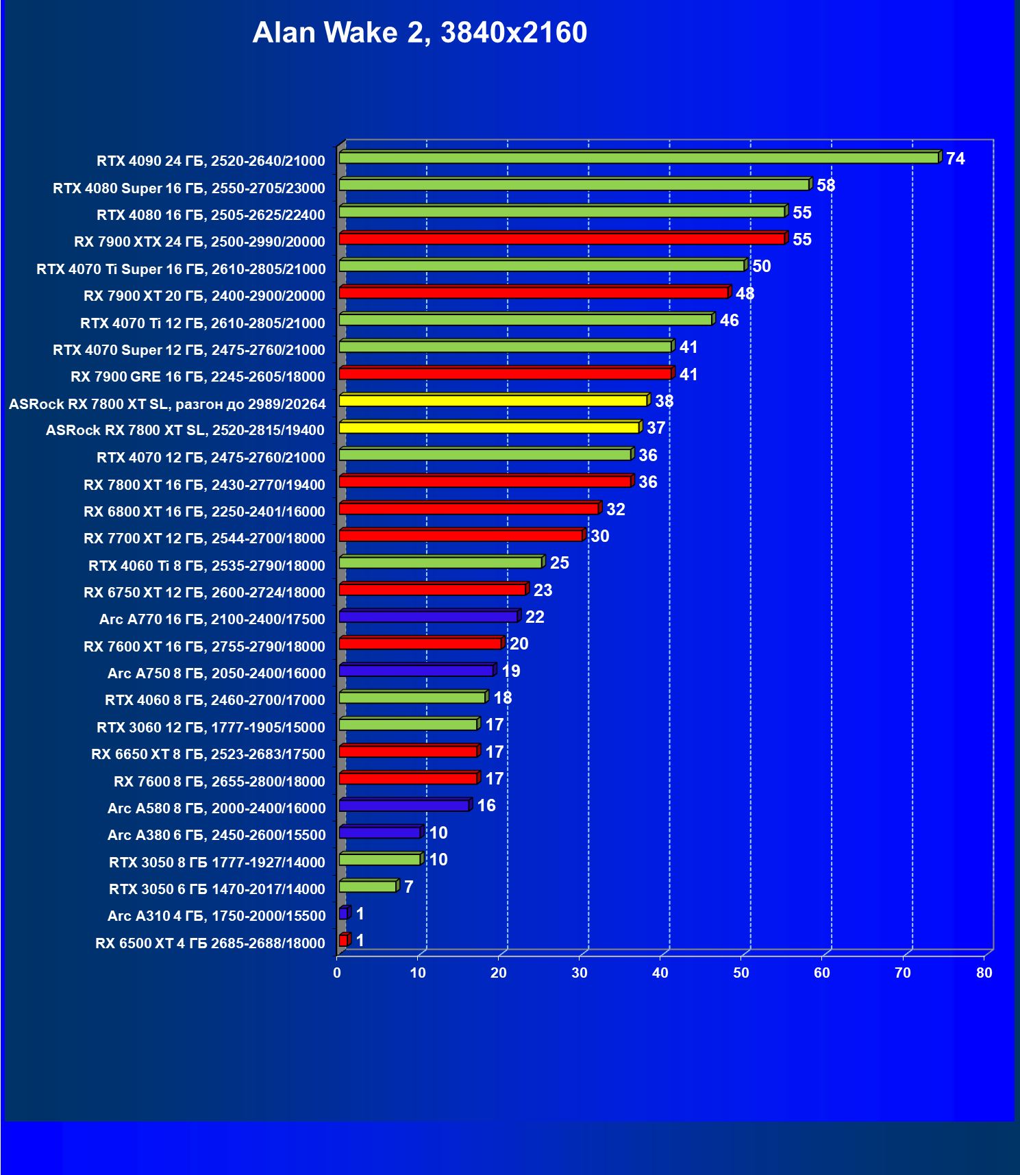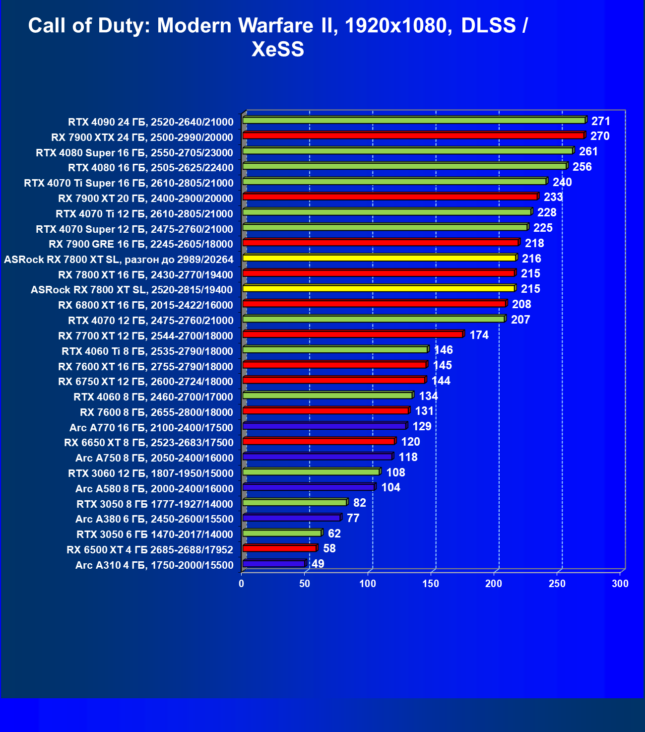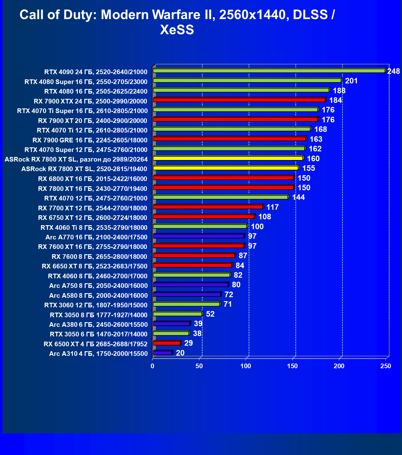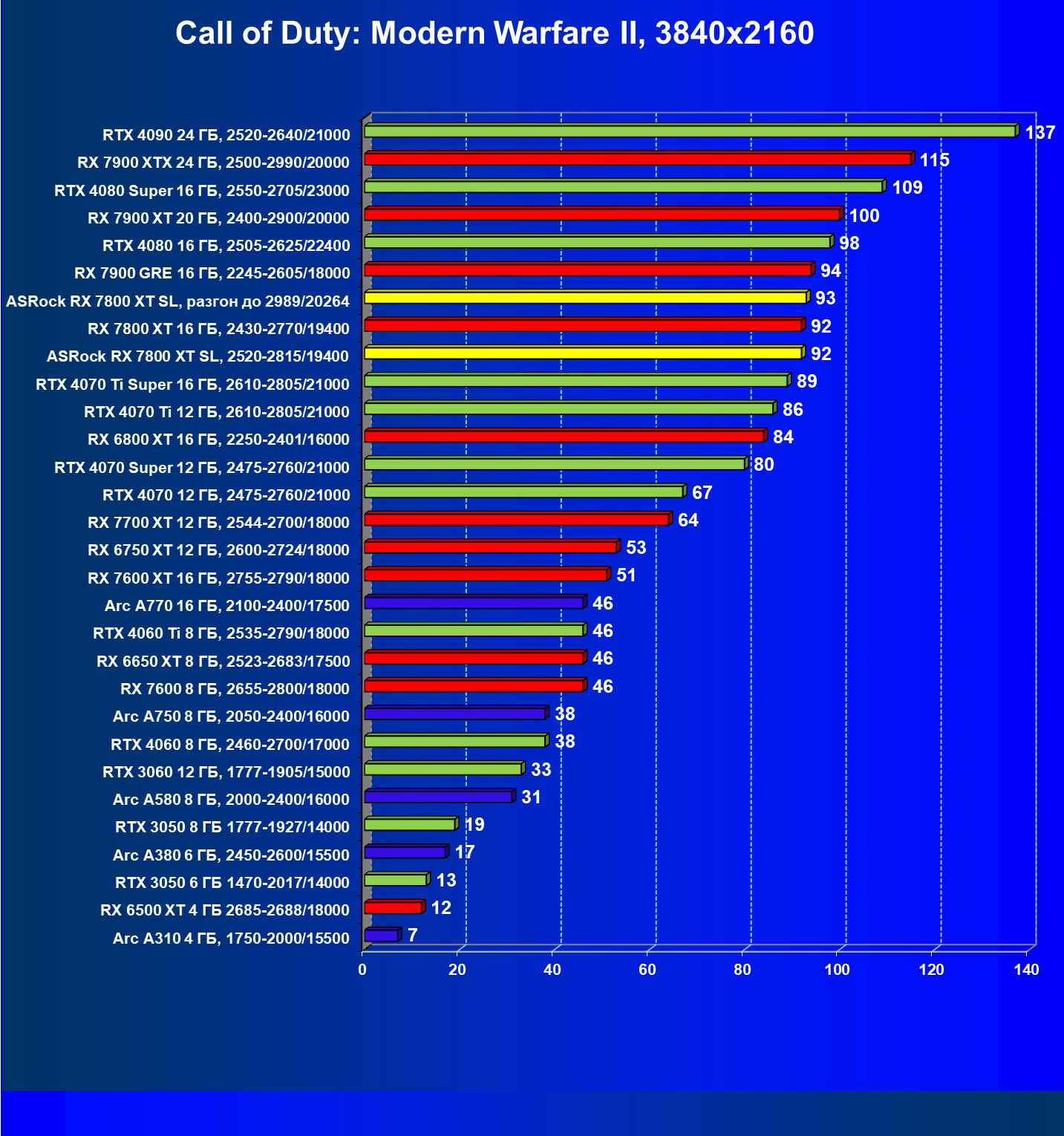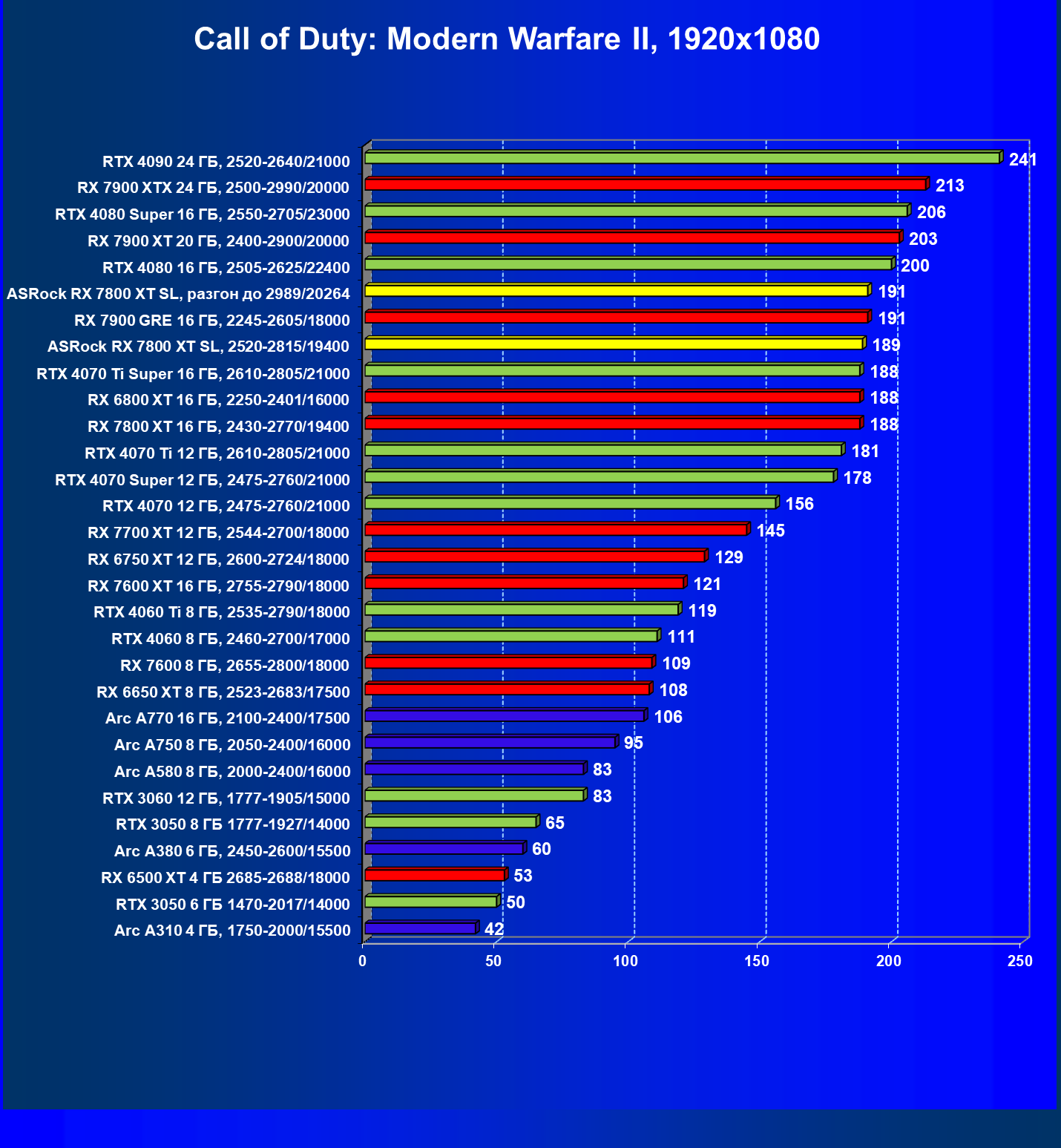 | 05 | RX 7800 XT 16 ГБ, 2430—2770/19400 | 201 | 1103 | 55 000 |