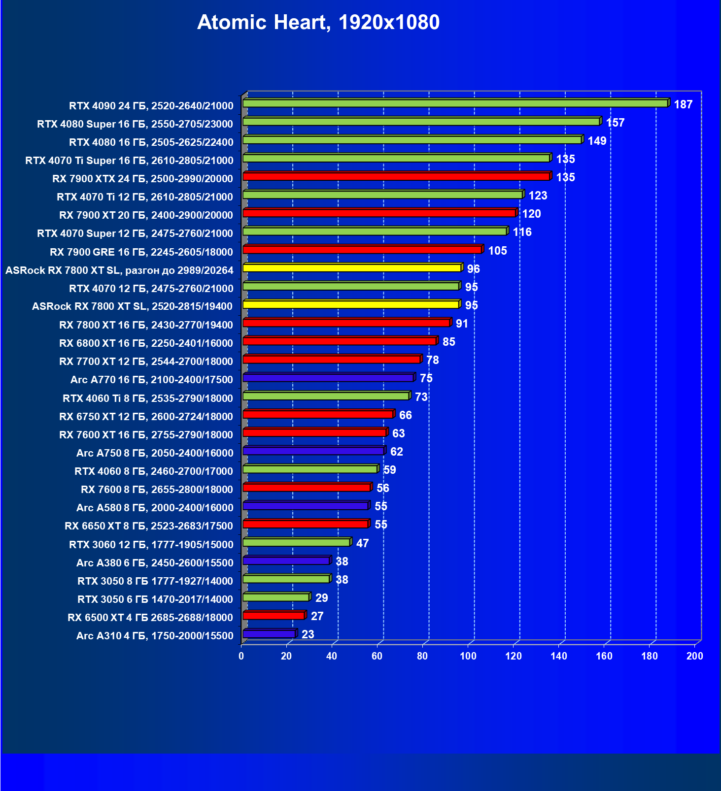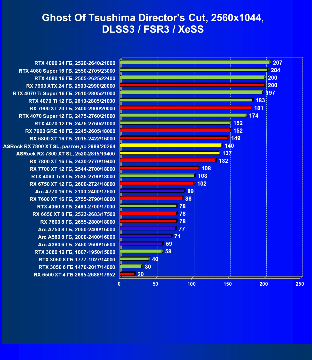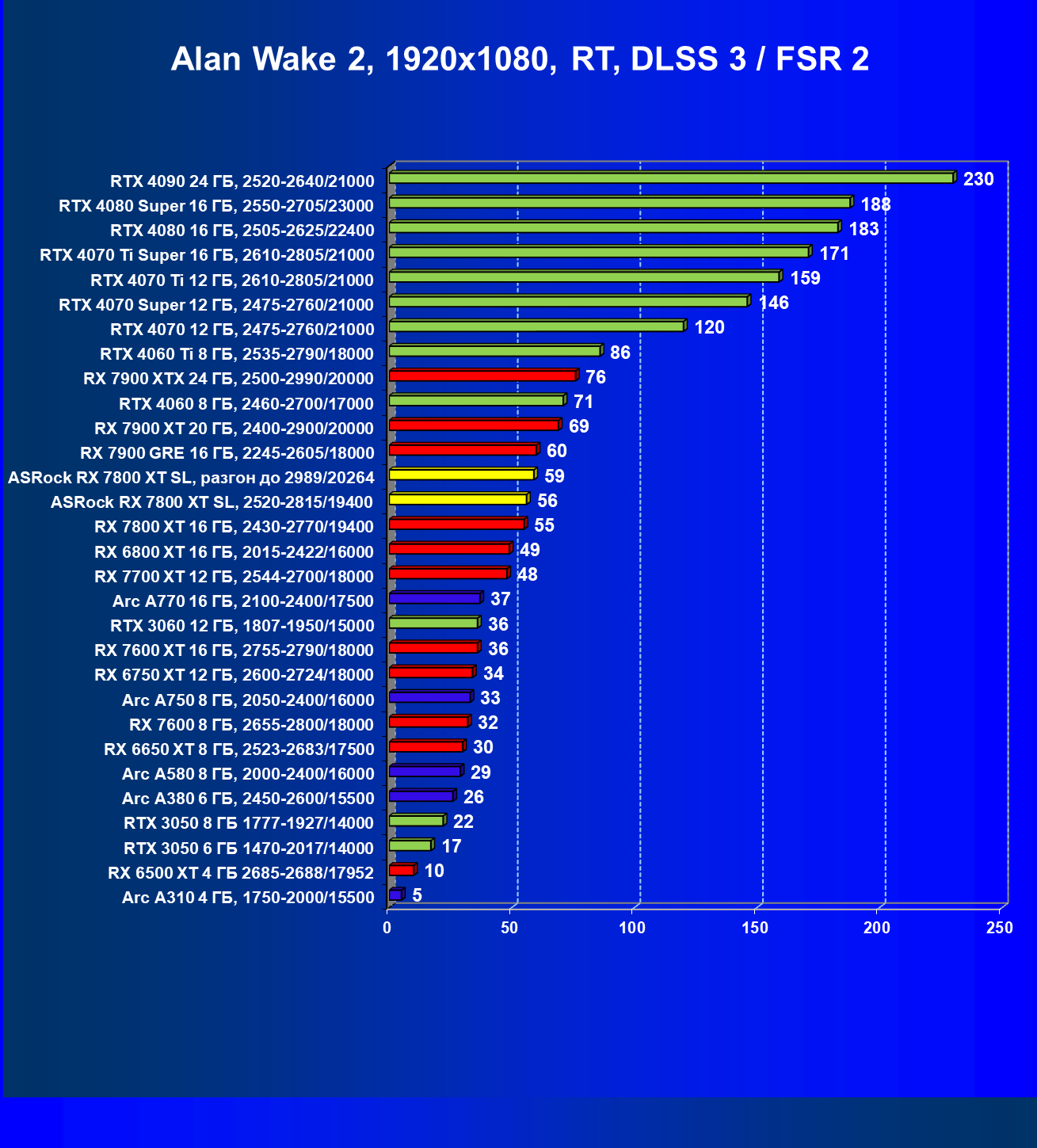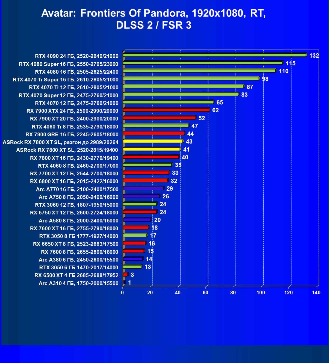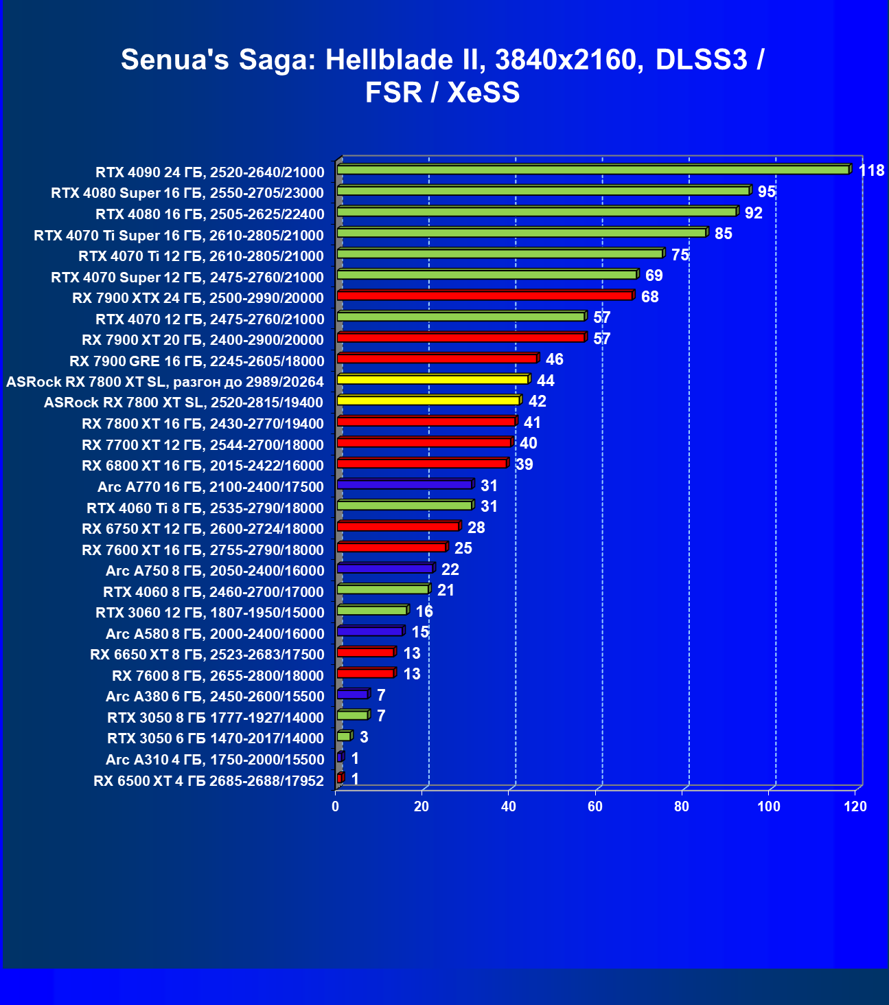 | 05 | RX 7800 XT 16 ГБ, 2430—2770/19400 | 201 | 1103 | 55 000 |