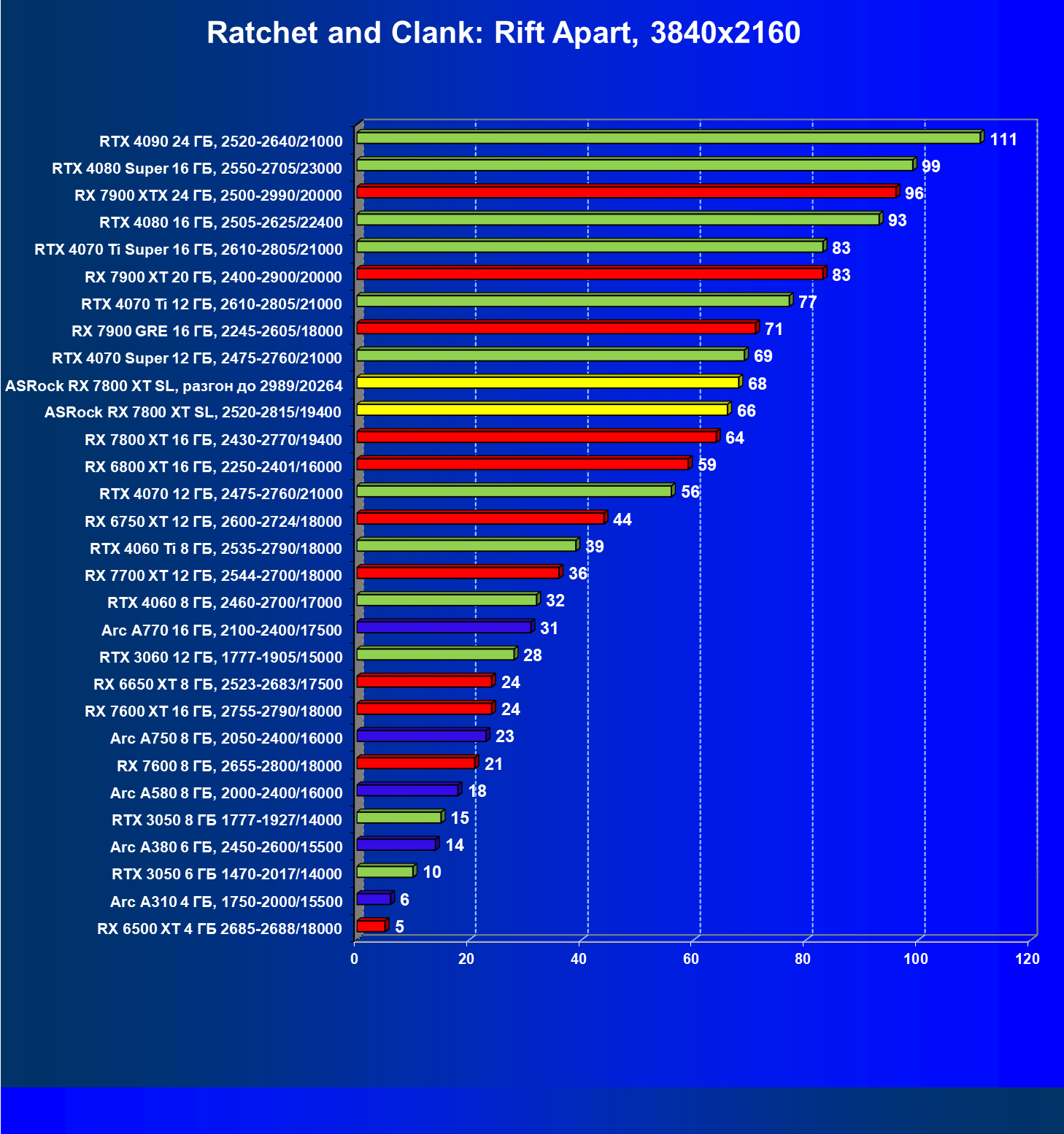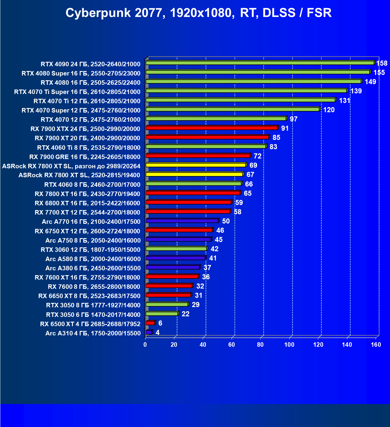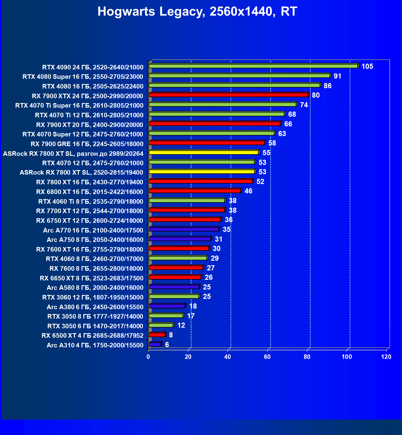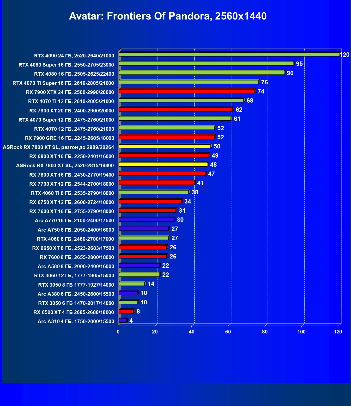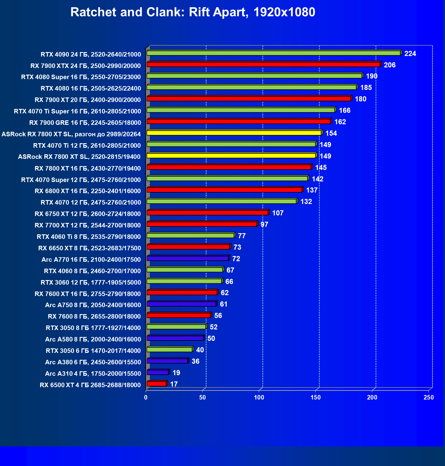 | 05 | RX 7800 XT 16 ГБ, 2430—2770/19400 | 201 | 1103 | 55 000 |