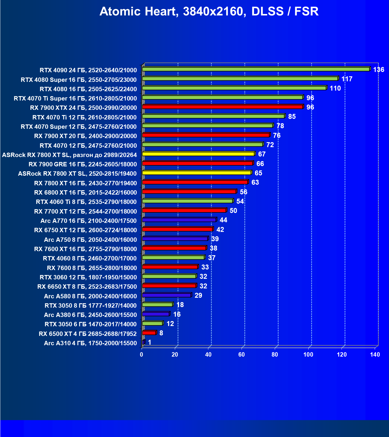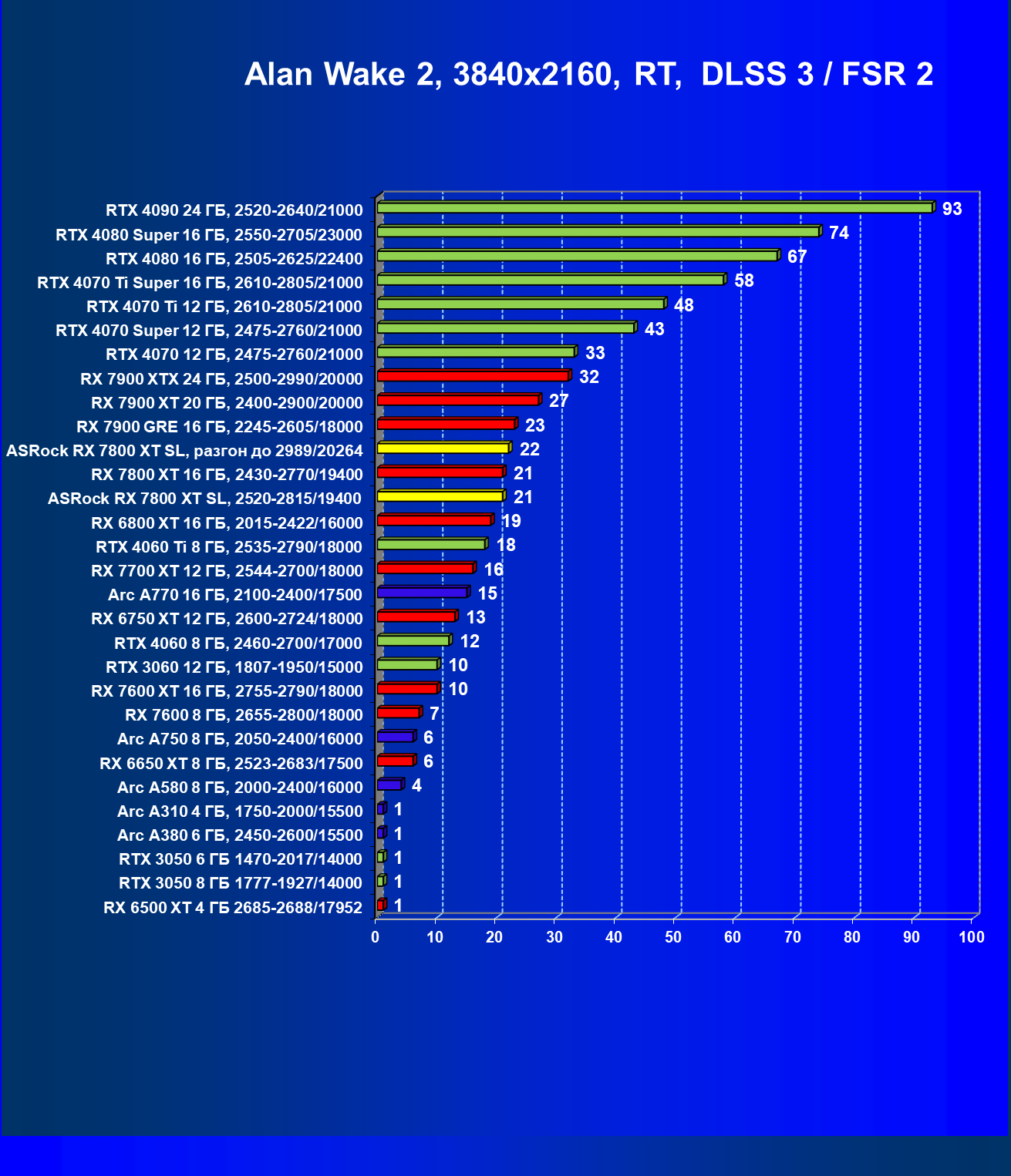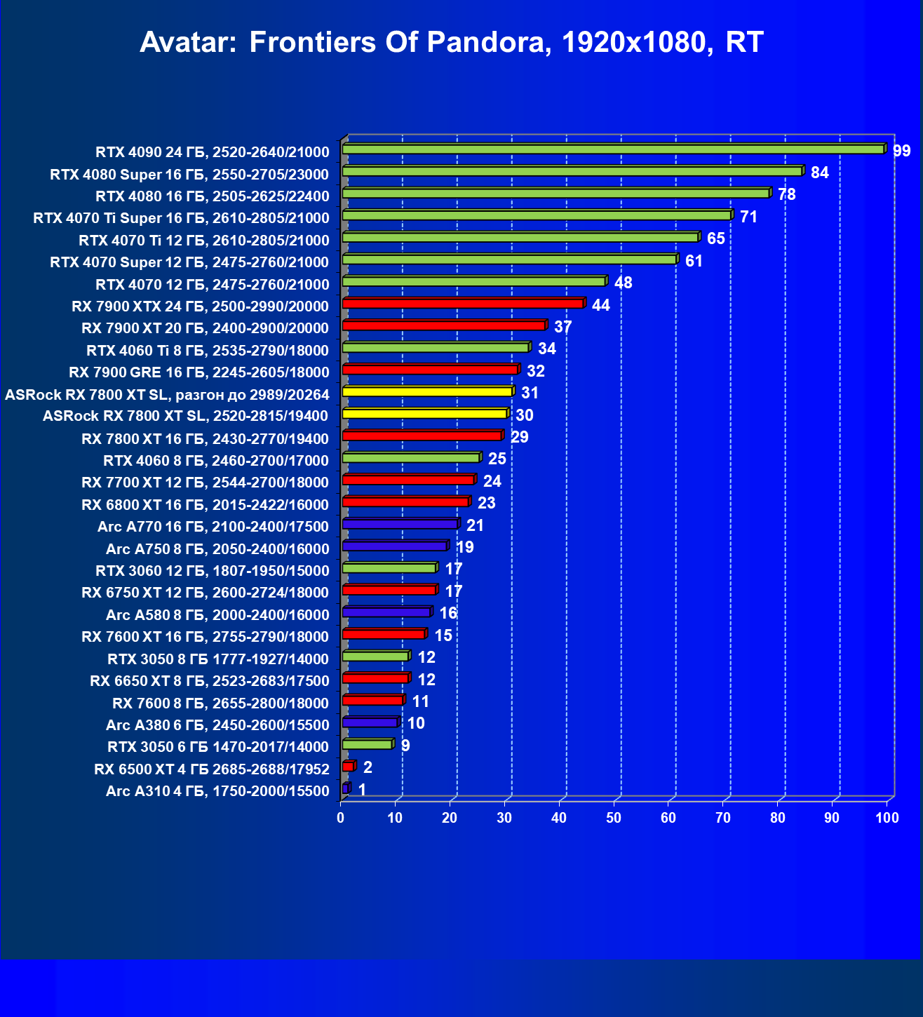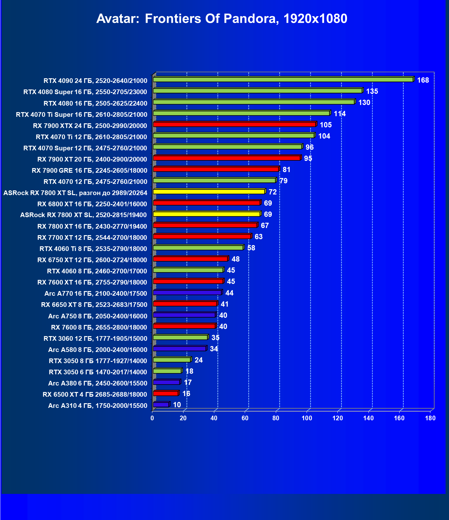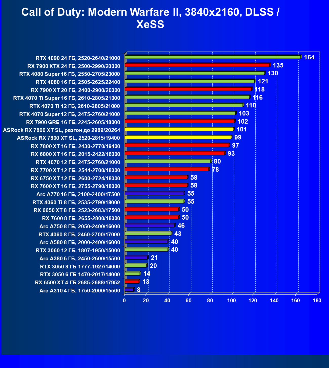 | 05 | RX 7800 XT 16 ГБ, 2430—2770/19400 | 201 | 1103 | 55 000 |