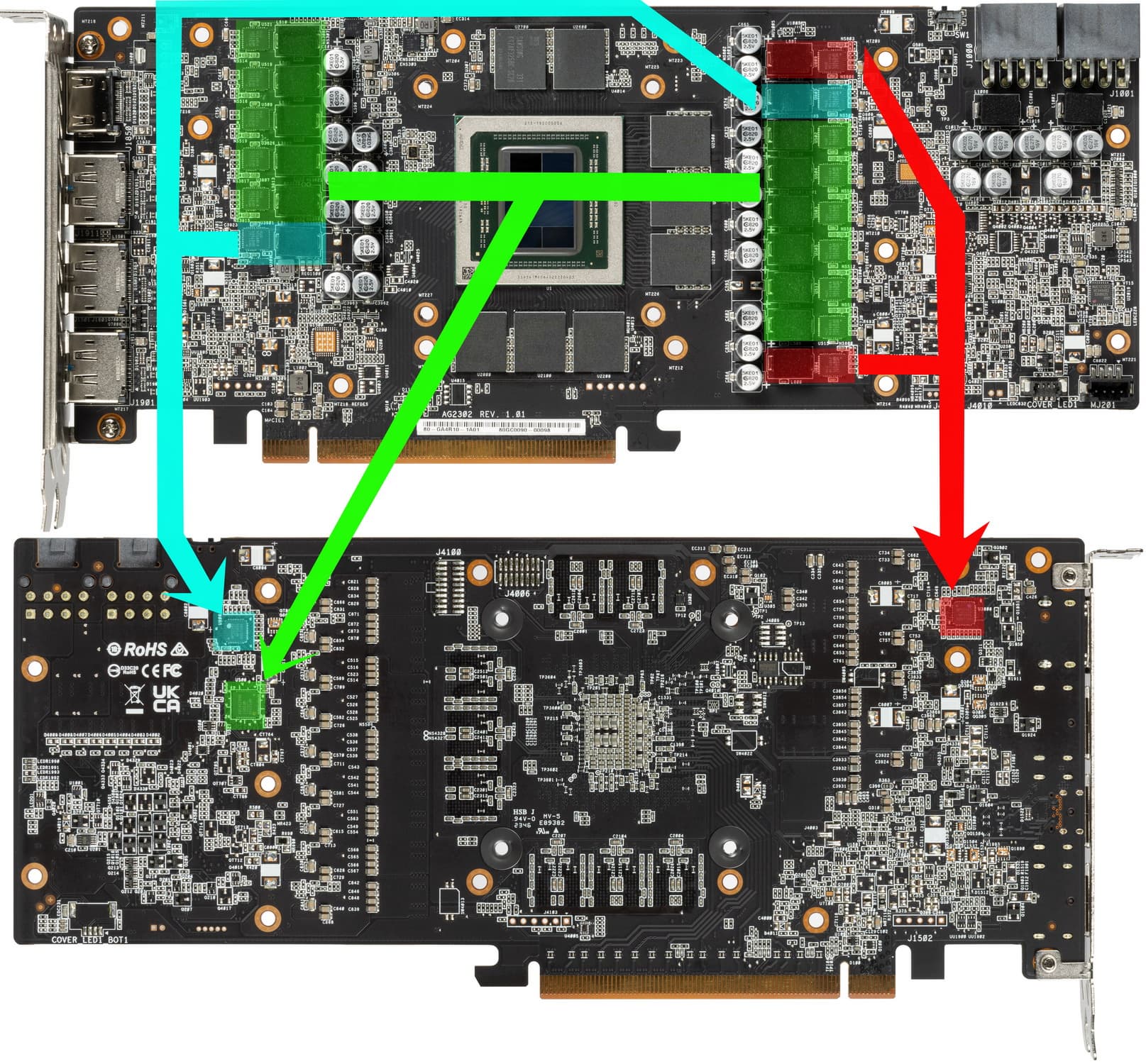 Зеленым цветом отмечена схема питания ядра, красным — памяти, голубым — питания SoC. Все ШИМ-контроллеры расположены на оборотной стороне PCB.