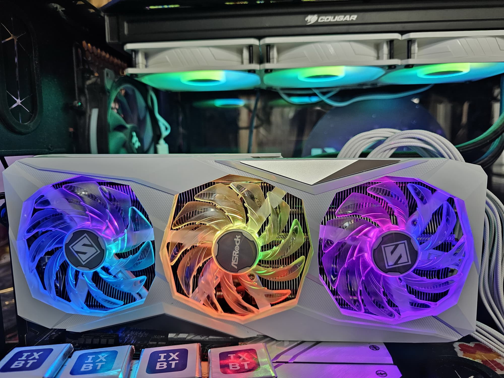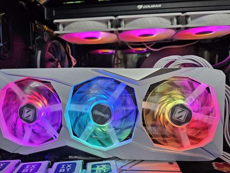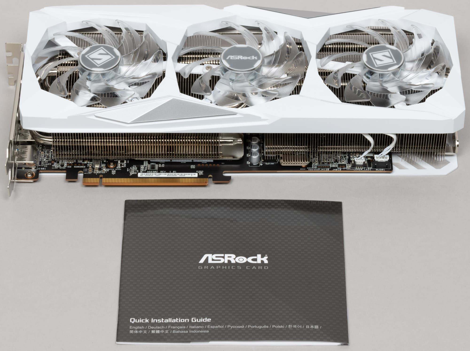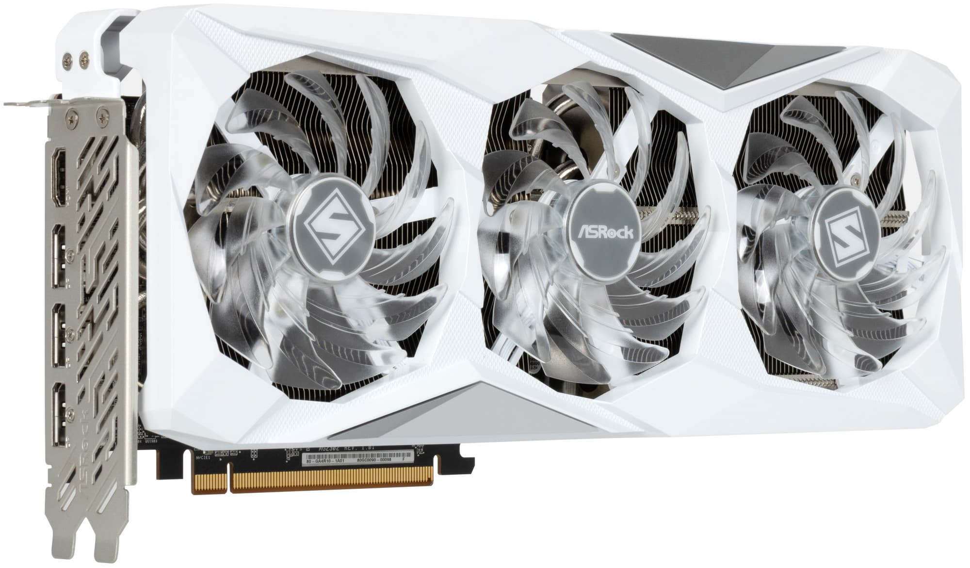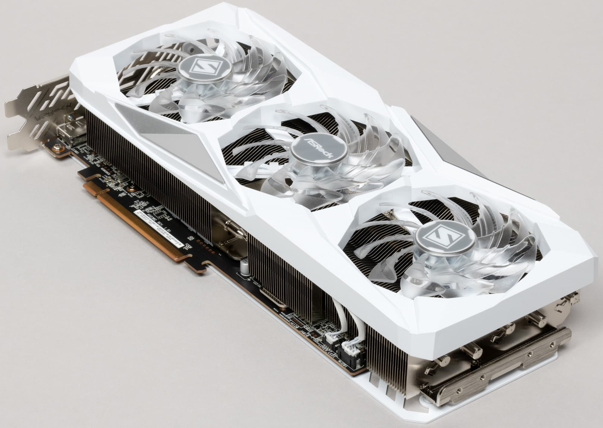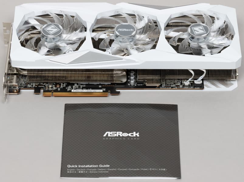 Карта ASRock имеет два 8-контактных разъема питания версии PCIe 2.0. Отметим красивый белый дизайн карты и ARGB-подсветку вентиляторов, которую можно отключить аппаратно. Производитель декларирует наличие 3-летней гарантии на эту карту.