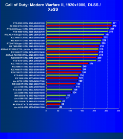 Рейтинг составлен по 9 тестам, в которых используется технология трассировки лучей и одновременно технология Nvidia DLSS, AMD FSR или Intel XeSS. Этот рейтинг нормирован по самому слабому ускорителю — Arc A310 (то есть сочетание скорости и функций Arc A310 приняты за 100%).