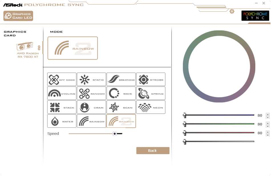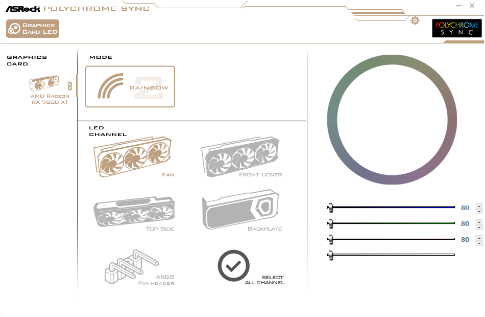 У карты подсвечены все три вентилятора. Управление осуществляется через утилиту ASRock Polychrome Sync. Синхронизация работы подсветки возможна только с материнскими платами ASRock.