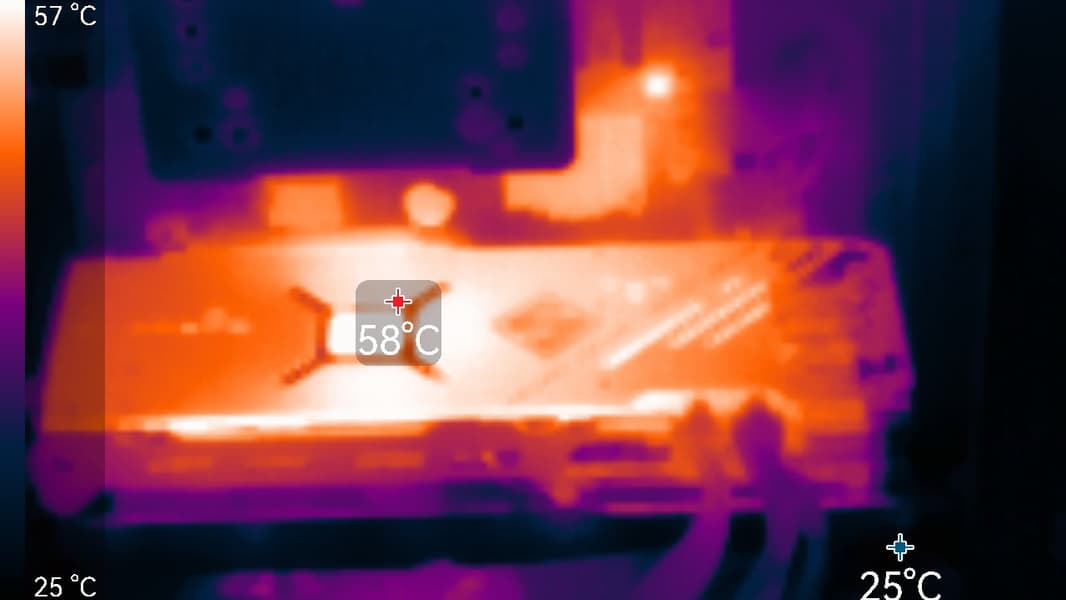 После 2-часового прогона под нагрузкой максимальная температура ядра не превысила 60 градусов (самой горячей точки — 78 °C), а температура микросхем памяти — 76 градусов, что является отличным результатом для видеокарт такого уровня. Энергопотребление карты доходило до 278 Вт.