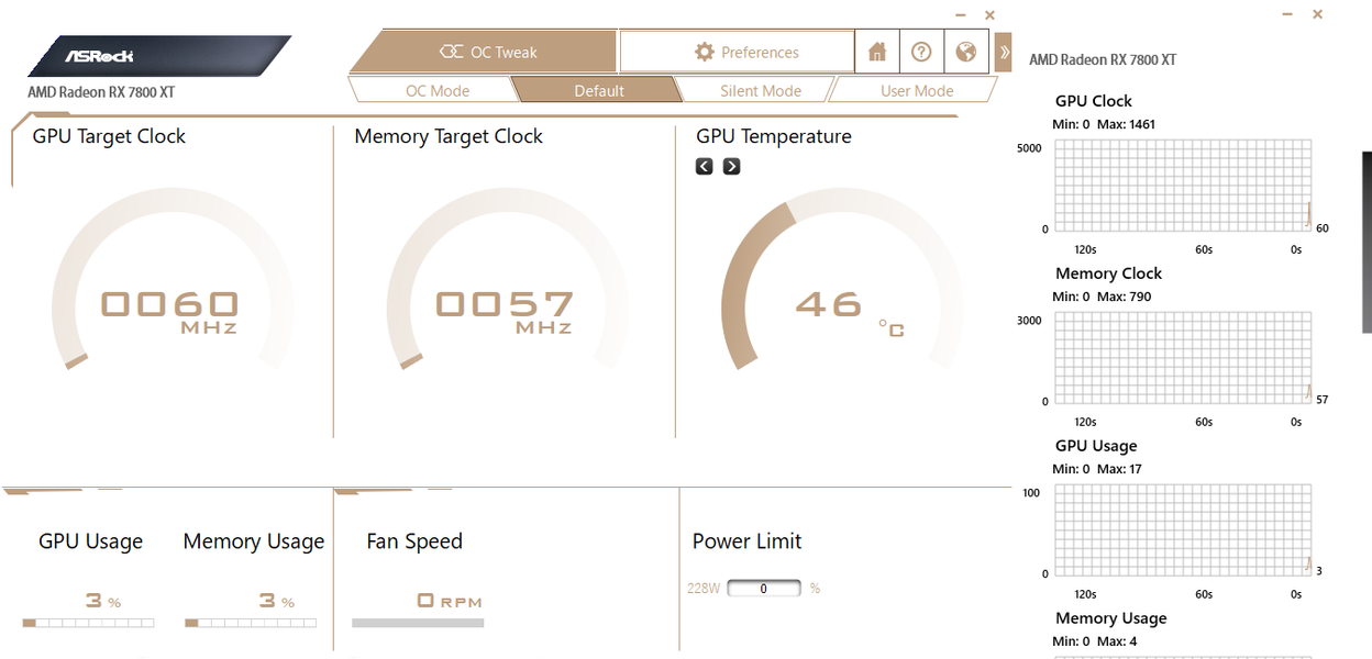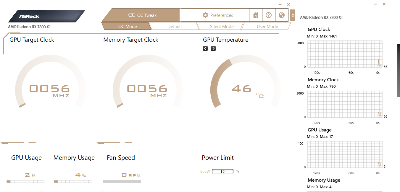 Управление работой карты обеспечивается с помощью фирменной утилиты OC Tweak. Она предлагает три варианта предустановленных параметров работы карты: OC Mode, по умолчанию и Silent Mode. Различия в частотах работы ядра у данных режимов минимальны, так что для разгона следует использовать режим User Mode с возможностью ручного управления частотами (или вообще использовать встроенную в ПО AMD панель производительности).
