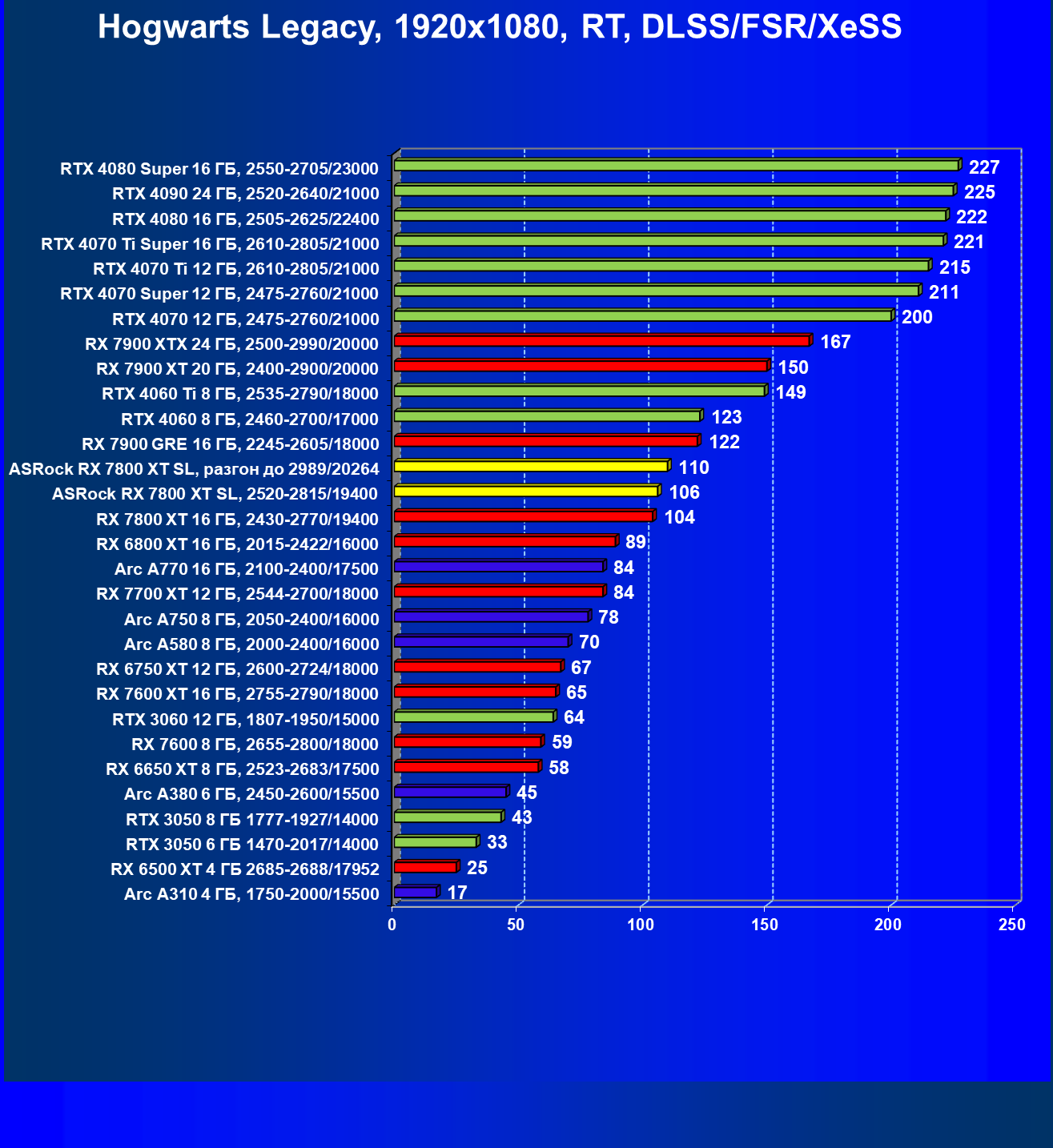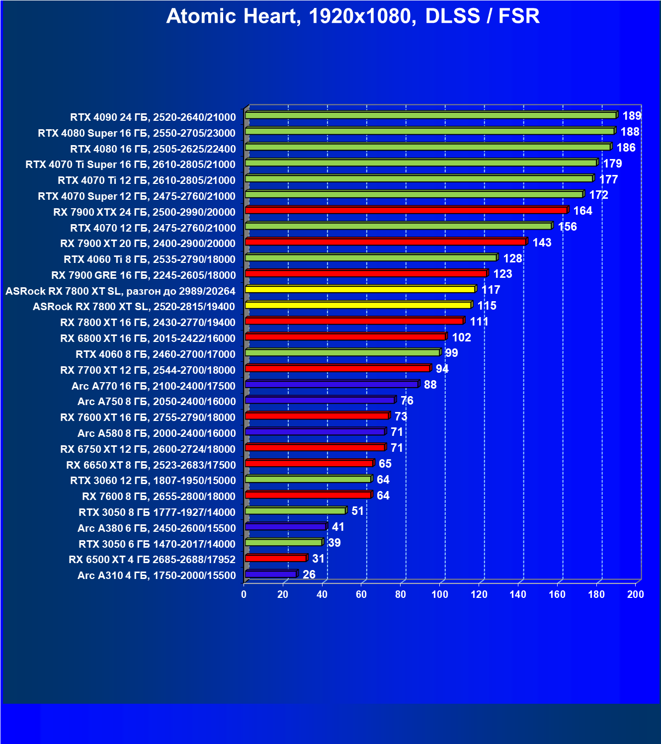 | 01 | ASRock RX 7800 XT SL, разгон до 2989/20264 | 211 | 1160 | 55 000 |