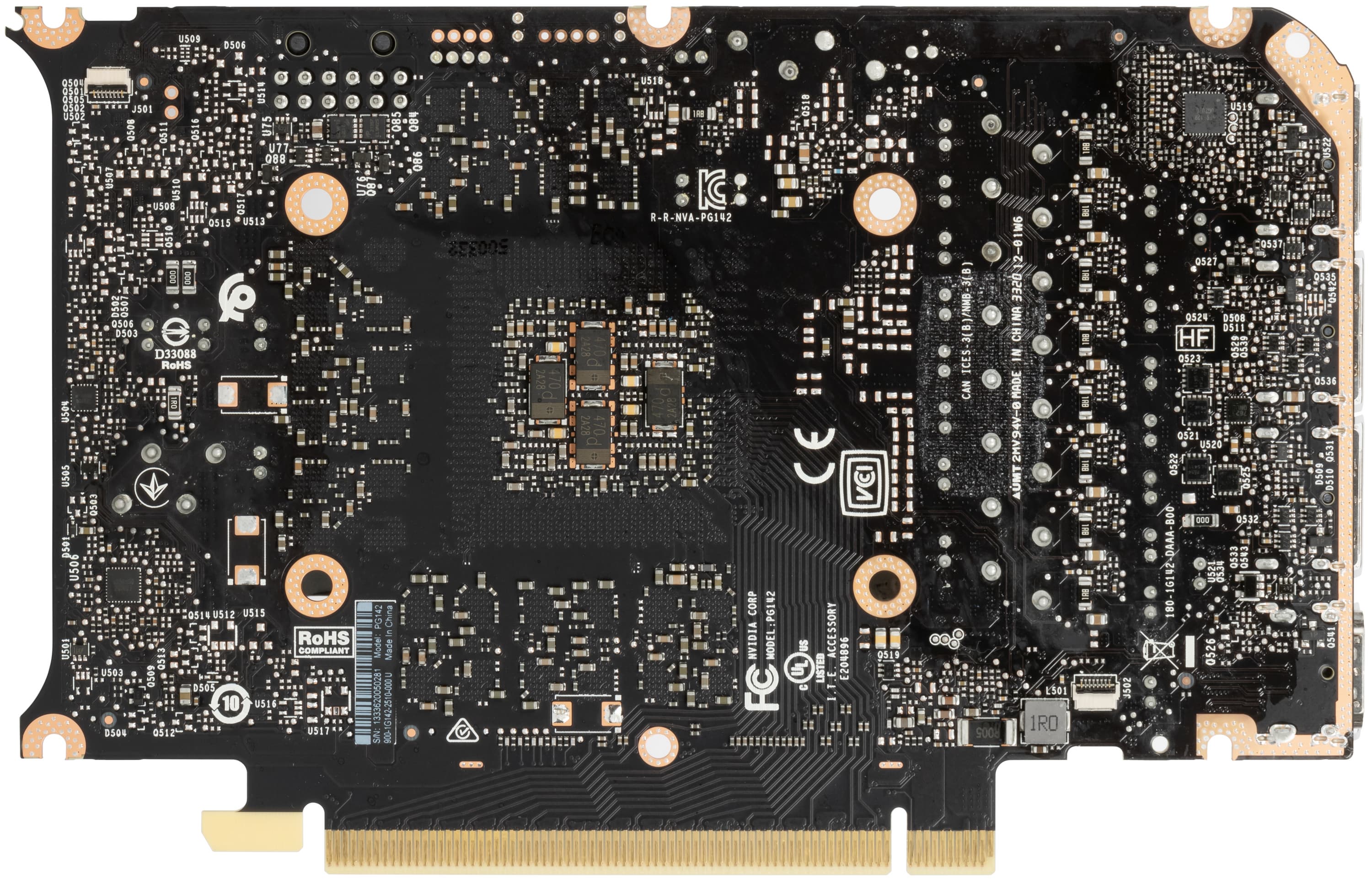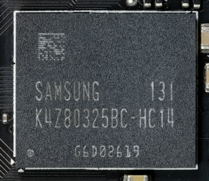 Карта имеет 8 ГБ памяти GDDR6 SDRAM, размещенной в 8 микросхемах по 8 Гбит на лицевой стороне PCB. Микросхемы памяти Samsung (GDDR6, K4Z80325BC-HC14) рассчитаны на условную номинальную частоту работы в 3500 (14000) МГц.