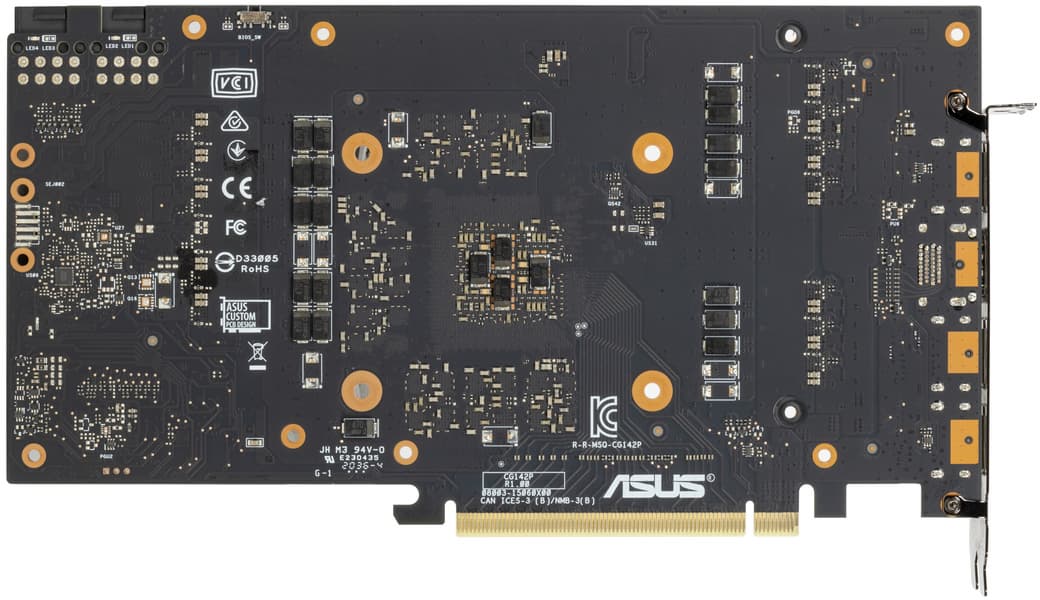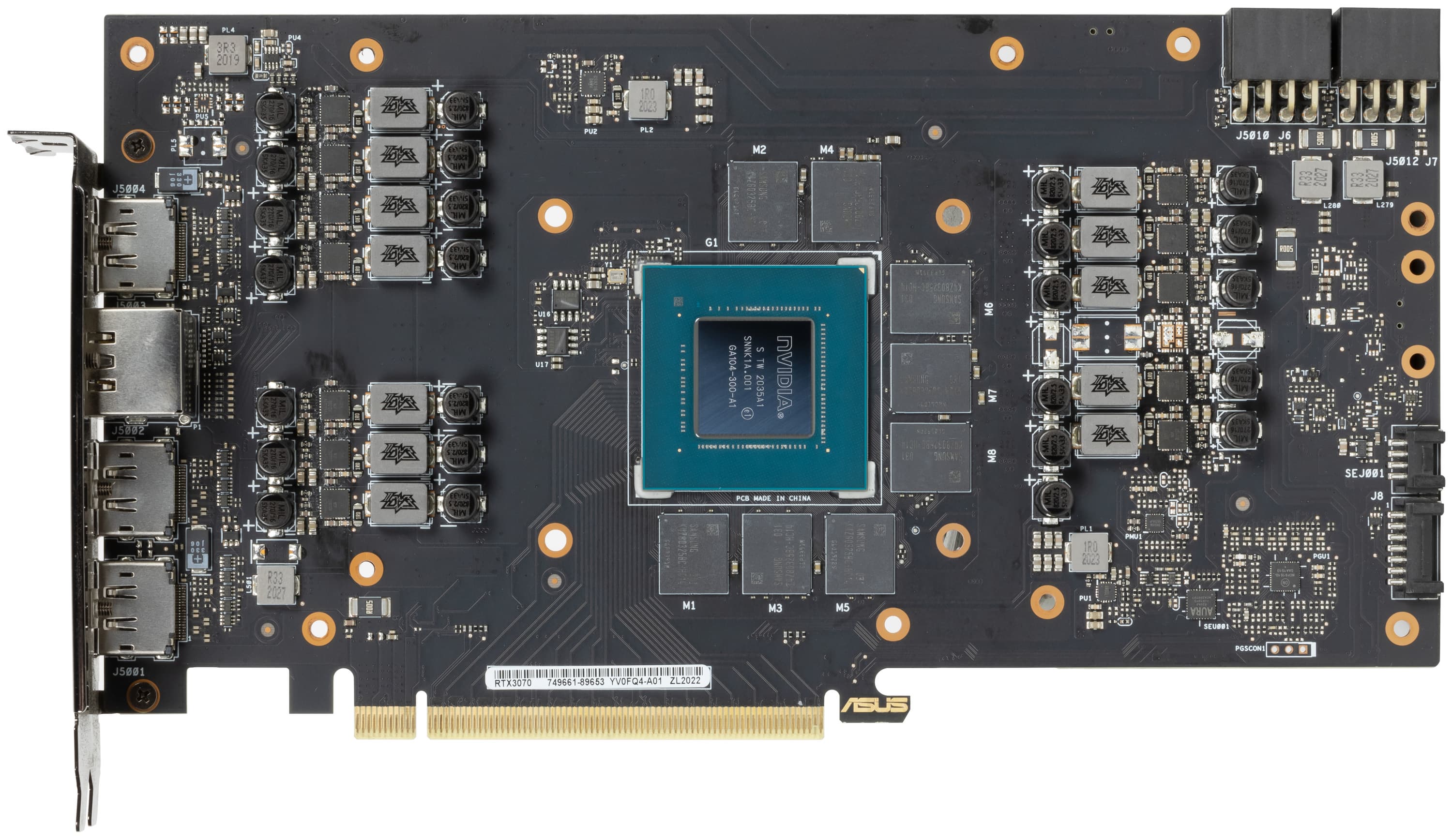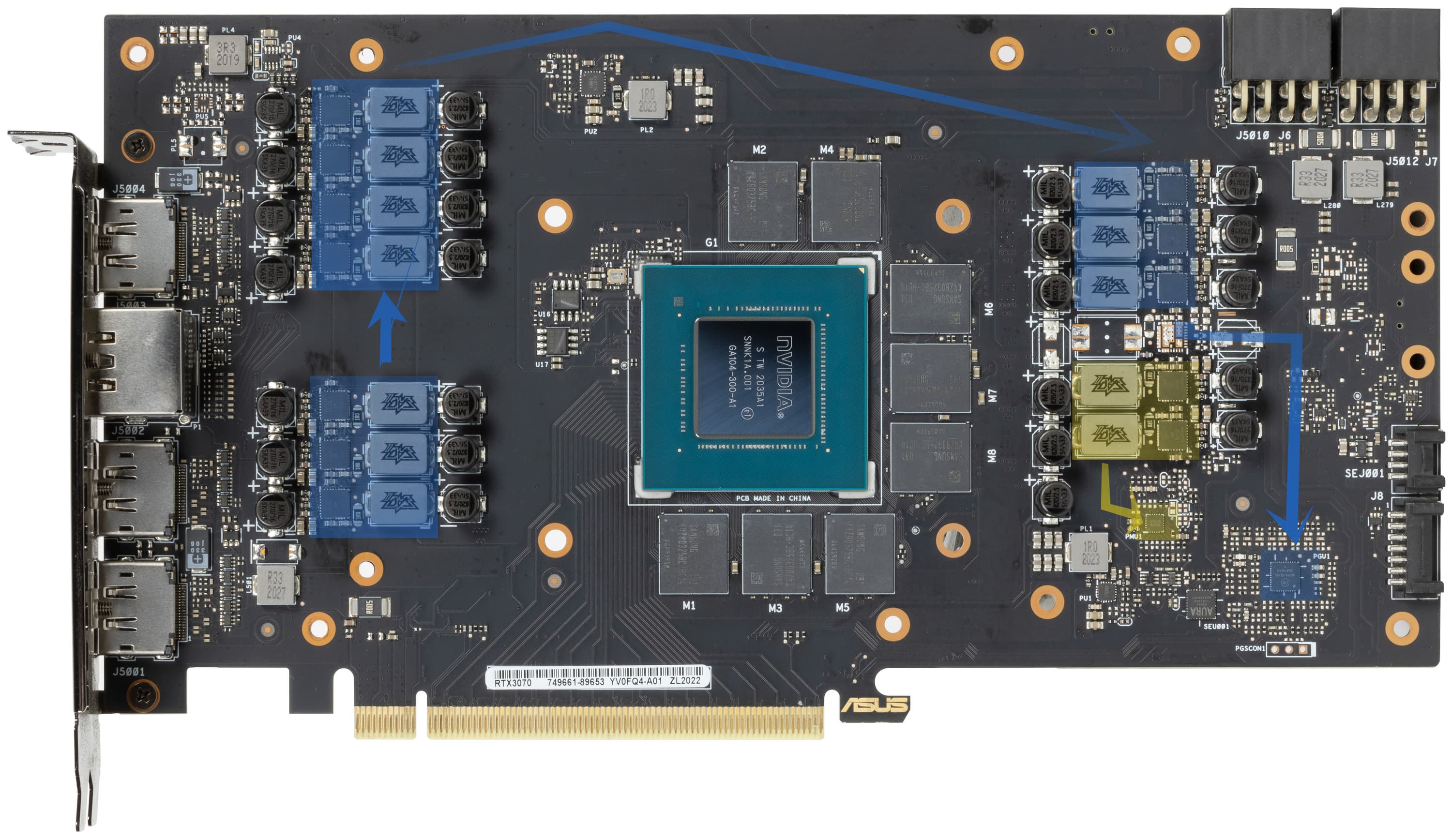 Суммарное количество фаз питания: у референс-карты GeForce RTX 3070 — 11 (9 на ядро, 2 на микросхемы памяти), у карты Asus — 12 (10 на ядро, 2 на микросхемы памяти)