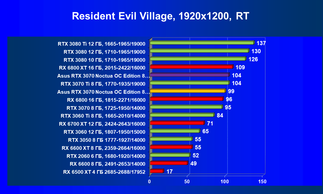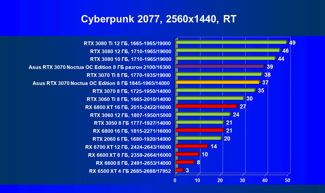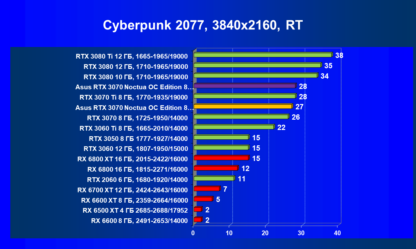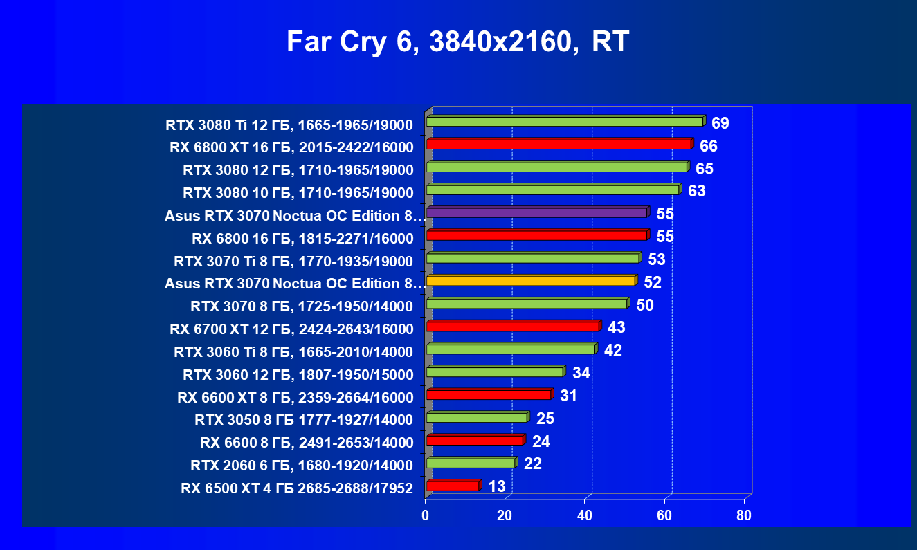 В большинстве игр (включая новые) без использования трассировки лучей видеокарта Asus RTX 3070 Noctua OC Edition демонстрирует играбельные 50 FPS в разрешении 4К. Разгон позволяет догнать RTX 3070 Ti, что является достойным результатом. Но превзойти RX 6800 не удается даже с ручным разгоном, и в играх без использования RT видеокарта RX 6800 выглядит более предпочтительной, так как ценник у них почти одинаковый.