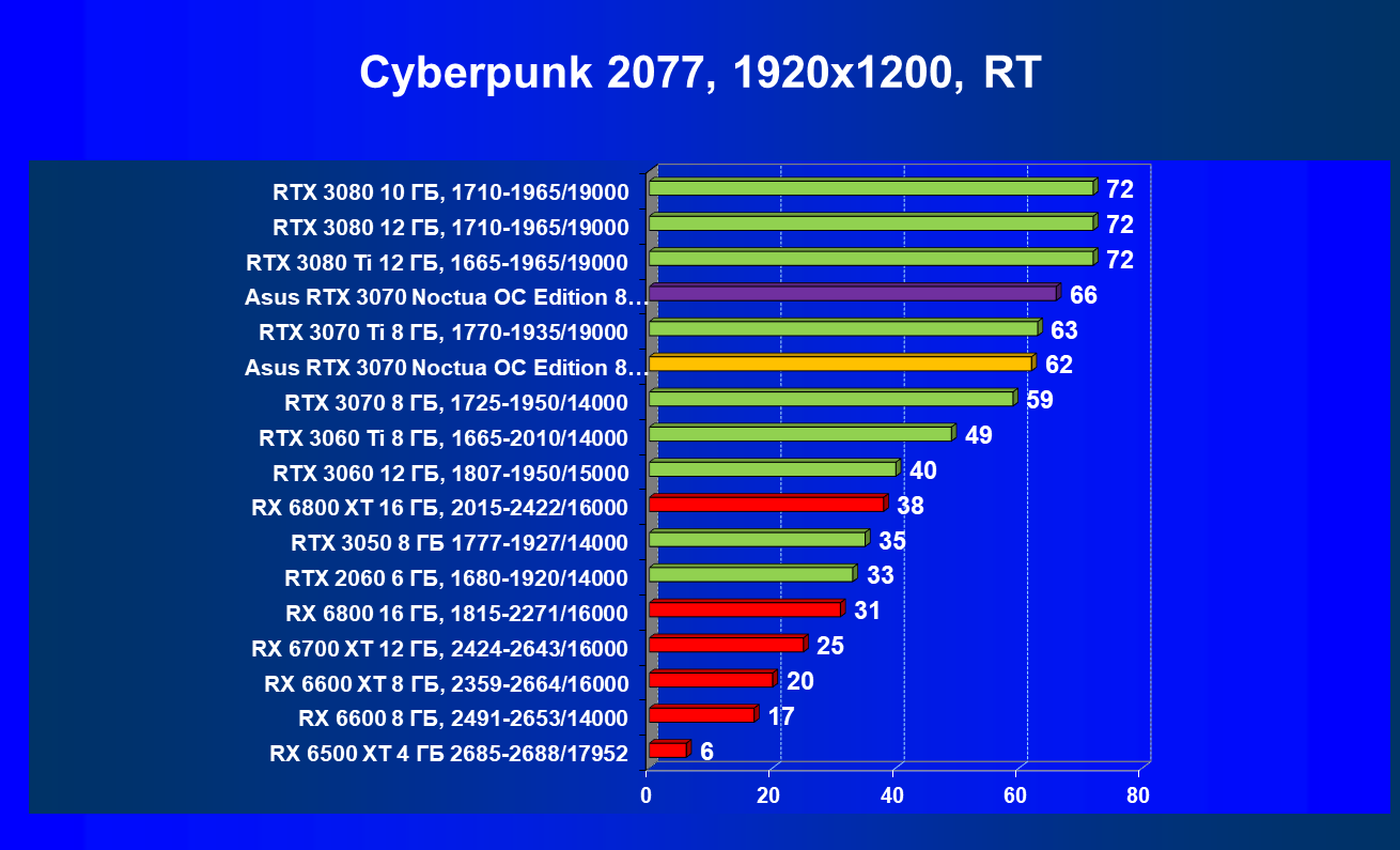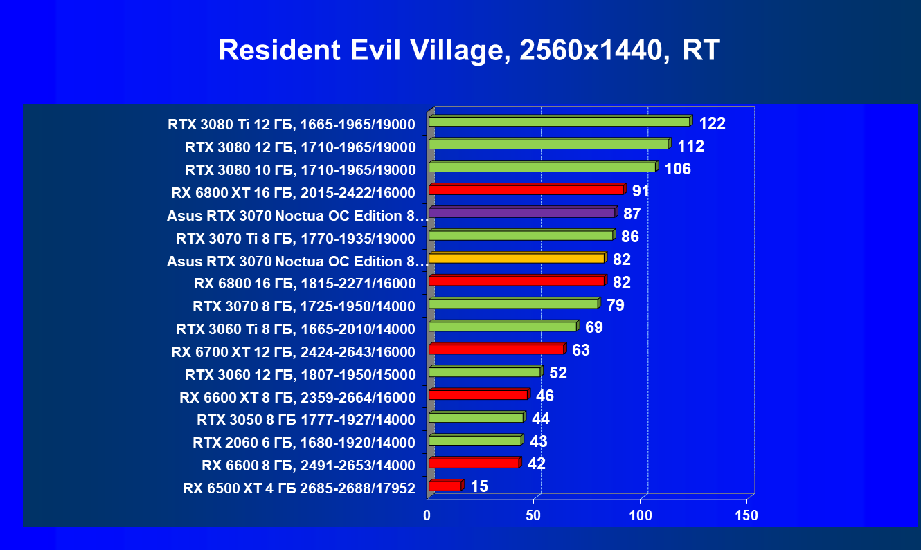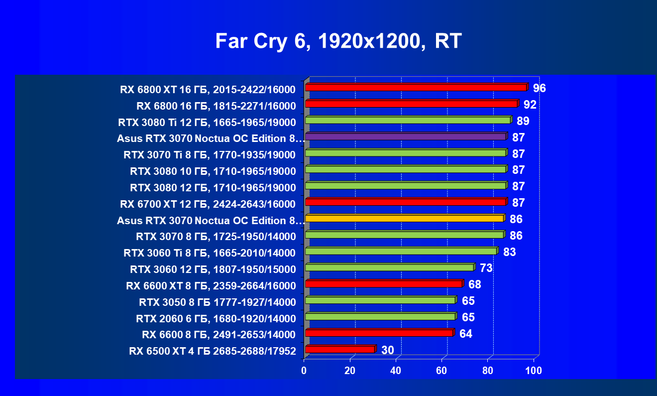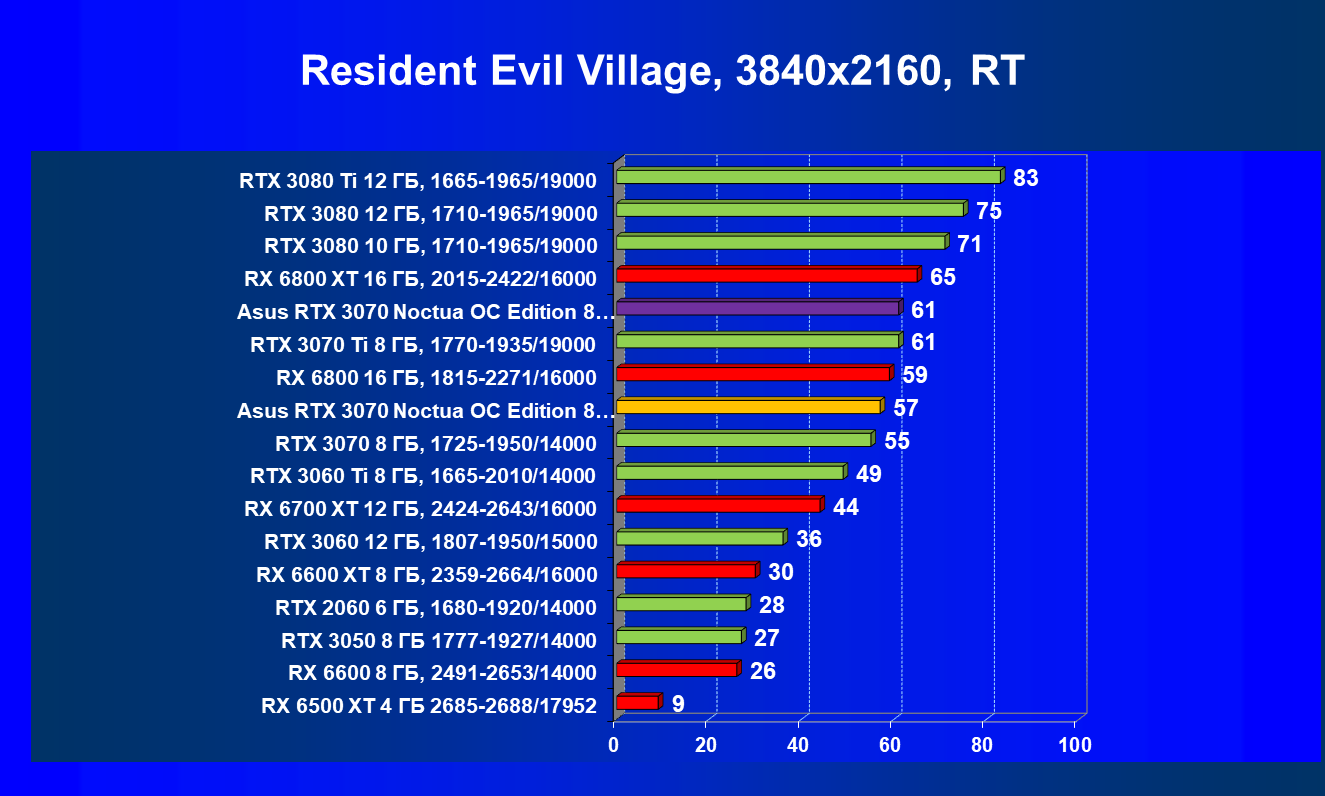 В большинстве игр (включая новые) без использования трассировки лучей видеокарта Asus RTX 3070 Noctua OC Edition демонстрирует играбельные 50 FPS в разрешении 4К. Разгон позволяет догнать RTX 3070 Ti, что является достойным результатом. Но превзойти RX 6800 не удается даже с ручным разгоном, и в играх без использования RT видеокарта RX 6800 выглядит более предпочтительной, так как ценник у них почти одинаковый.