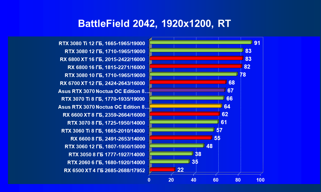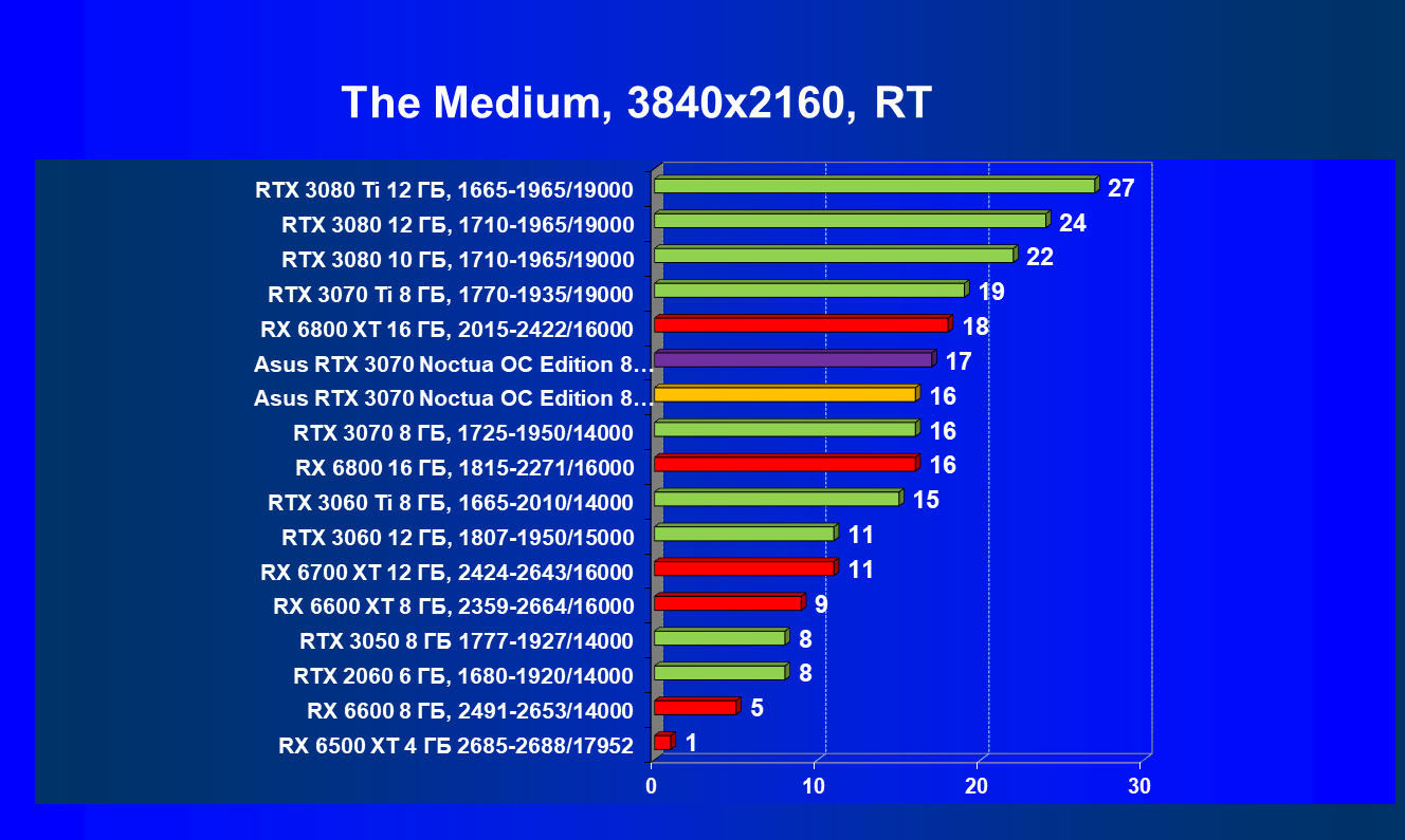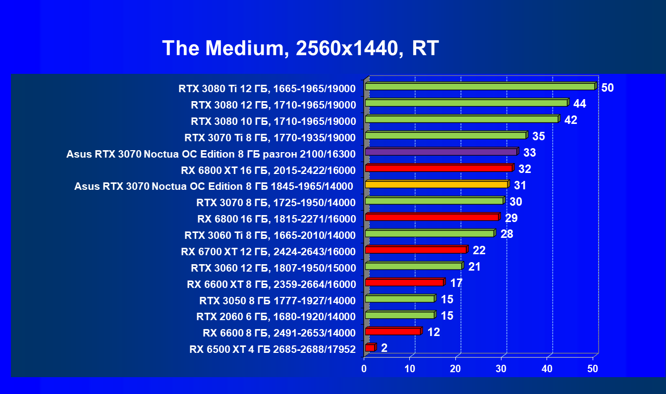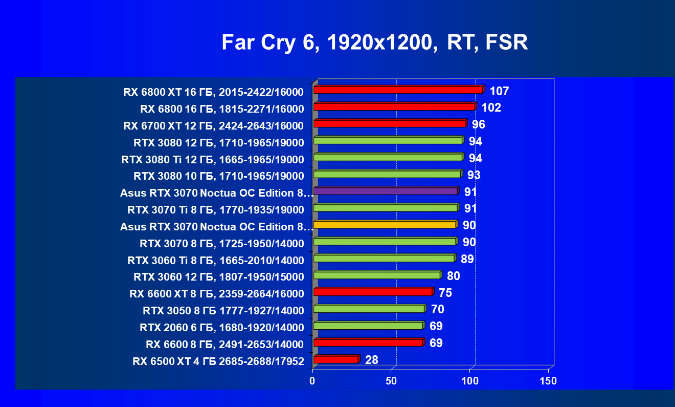 В большинстве игр (включая новые) без использования трассировки лучей видеокарта Asus RTX 3070 Noctua OC Edition демонстрирует играбельные 50 FPS в разрешении 4К. Разгон позволяет догнать RTX 3070 Ti, что является достойным результатом. Но превзойти RX 6800 не удается даже с ручным разгоном, и в играх без использования RT видеокарта RX 6800 выглядит более предпочтительной, так как ценник у них почти одинаковый.