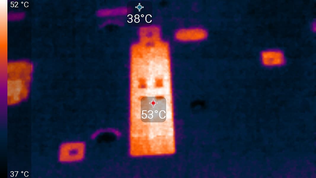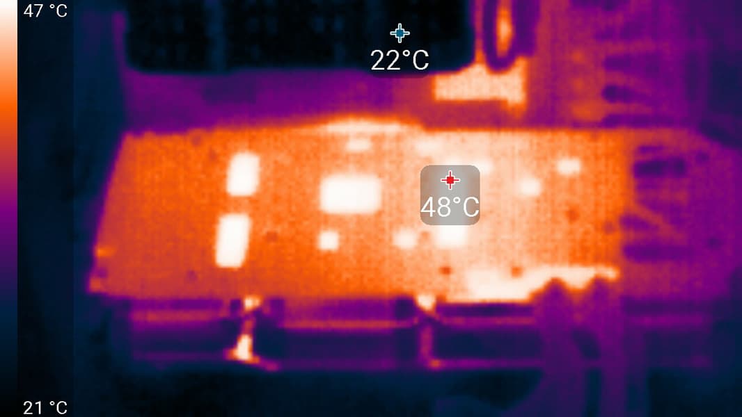В режиме BIOS 2 (Quiet) температура достигала 63 °C. Вентиляторы при этом раскручивались до 900 оборотов в минуту, а шум повышался лишь до 19,5 дБА: это практически бесшумно. Лист, падающий с дерева, издает больше шума, чем Asus GeForce RTX 3070 Noctua OC Edition.