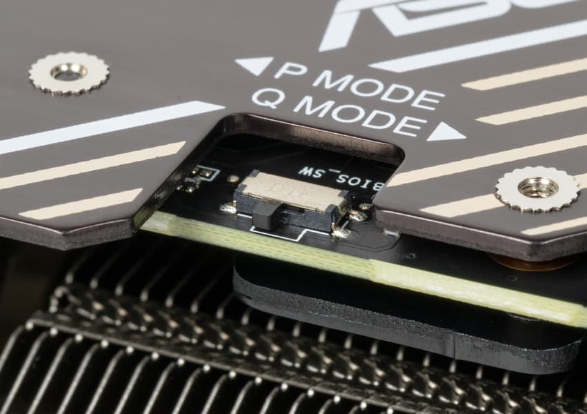 Питание подается через два 8-контактных разъема. Карта может работать в двух режимах (P Mode и Q Mode), их переключатель расположен на верхнем торце. В эти две версии BIOS загружены разные профили: P (Performance) Mode для максимальной производительности и Q (Quiet) Mode для низкого уровня шума, они отличаются схемой работы вентиляторов. Сам по себе этот подход типичен для карт Asus, мы видим те же режимы у всех их моделей, но в данном случае даже в профиле высокой производительности видеокарта работает очень тихо.