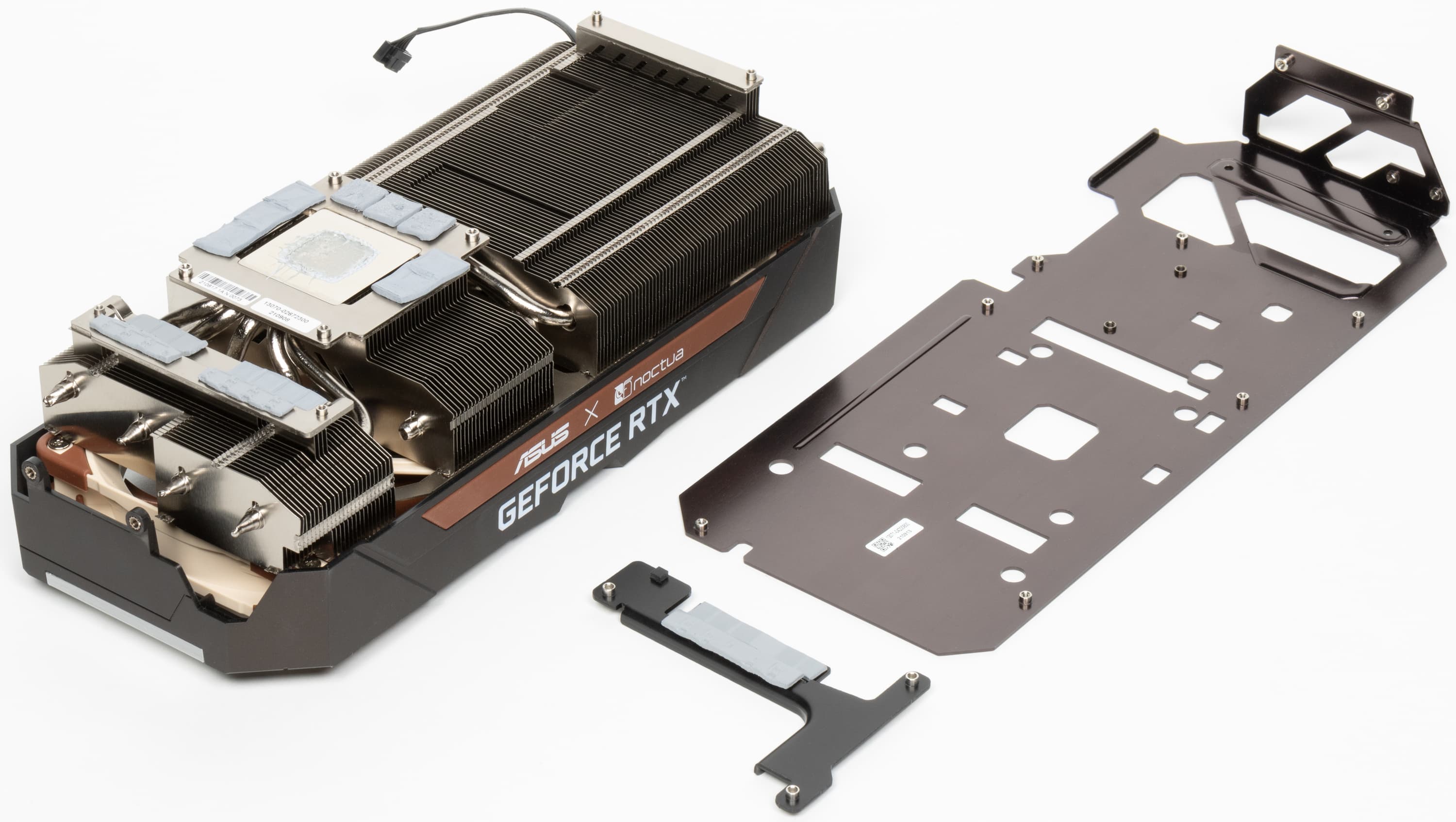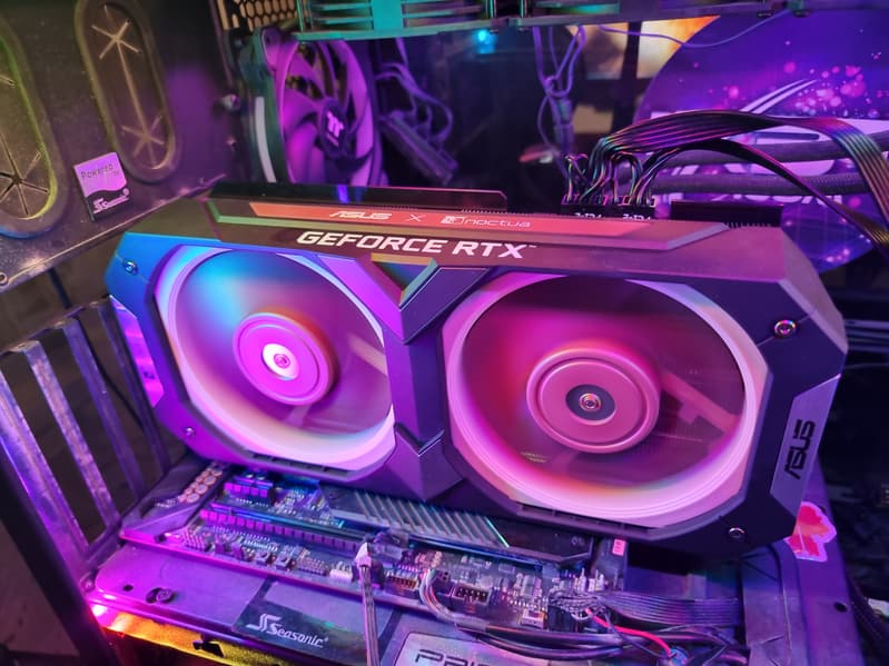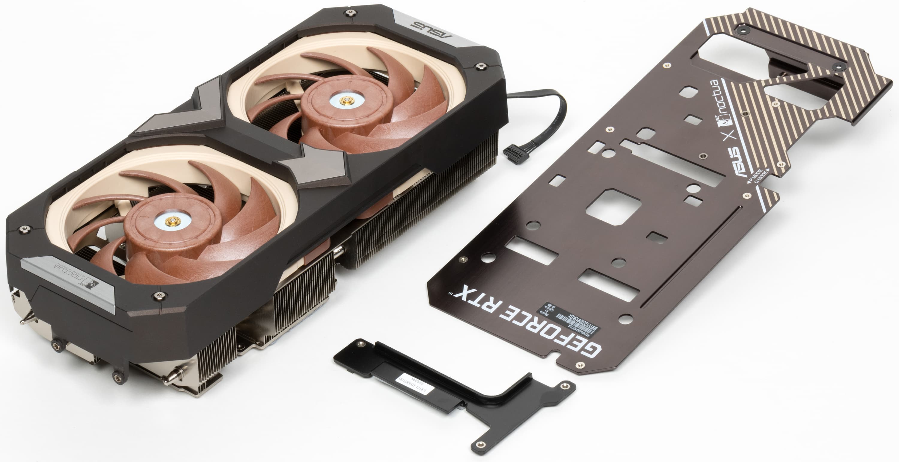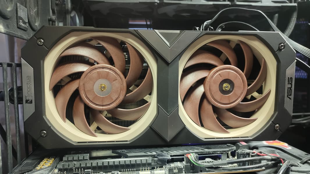 Разумеется, компания Asus выпустила уже не одну видеокарту на базе GeForce RTX 3070. В данном случае за основу взята Asus TUF Gaming GeForce RTX 3070 OC Edition (фотографии именно ее печатной платы приведены далее), но три 92-миллиметровых вентилятора заменены на два отмеченных наградами 120-миллиметровых вентилятора Noctua NF-A12x25, также адаптирован и радиатор. В результате получилась видеокарта с уникальным дизайном, которая не нуждается ни в какой подсветке, чтобы выделяться на общем фоне.