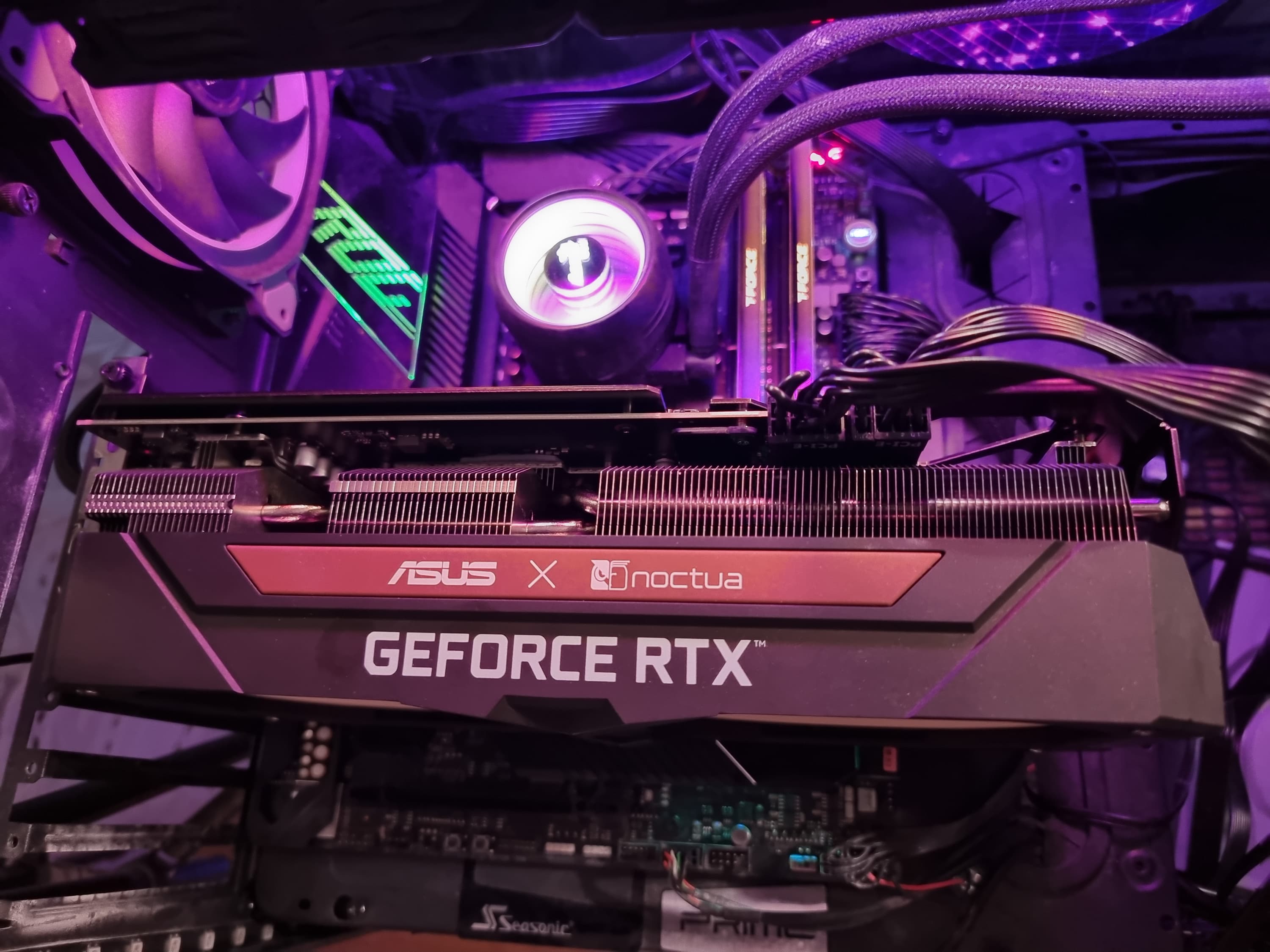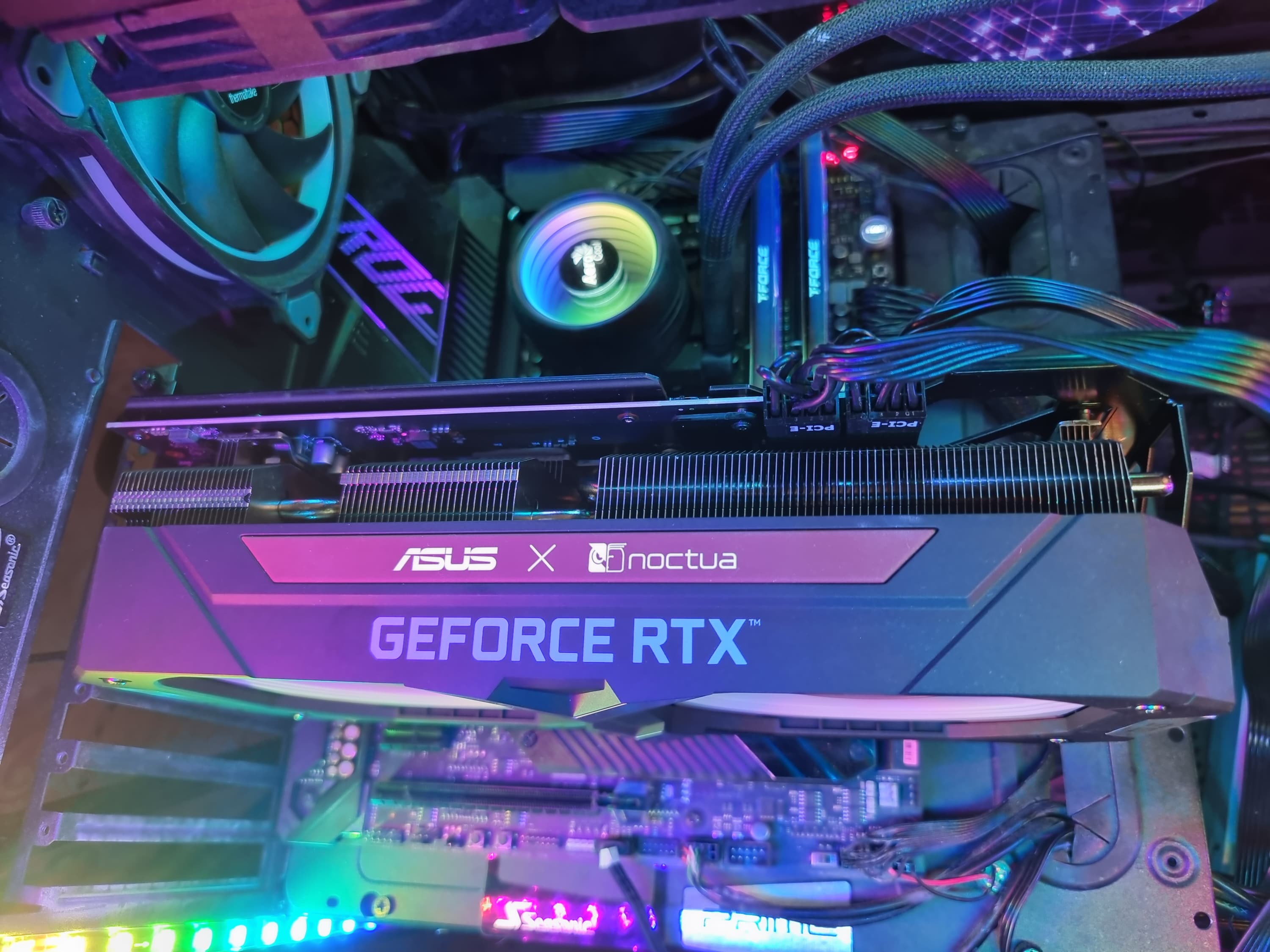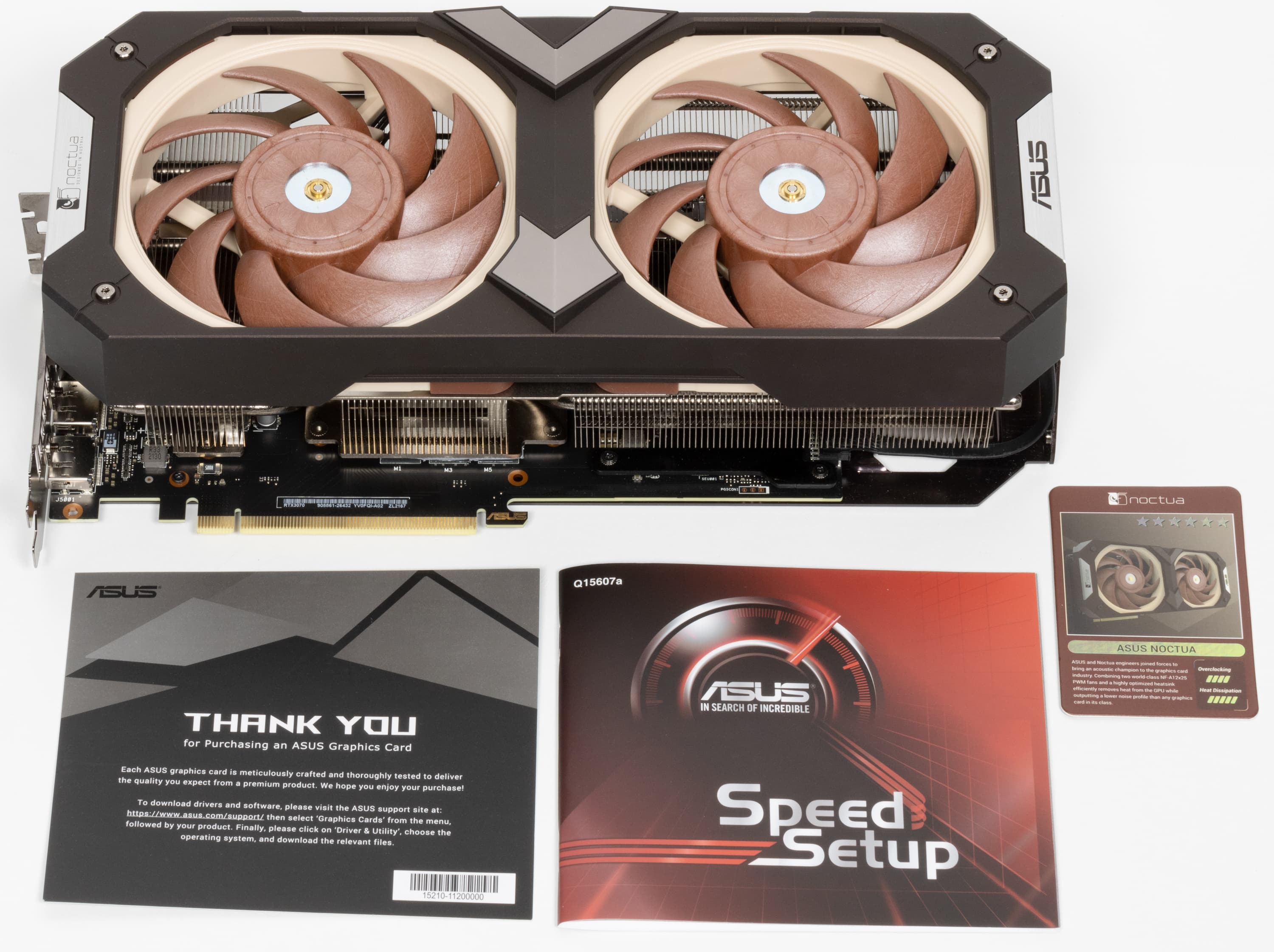 Разумеется, компания Asus выпустила уже не одну видеокарту на базе GeForce RTX 3070. В данном случае за основу взята Asus TUF Gaming GeForce RTX 3070 OC Edition (фотографии именно ее печатной платы приведены далее), но три 92-миллиметровых вентилятора заменены на два отмеченных наградами 120-миллиметровых вентилятора Noctua NF-A12x25, также адаптирован и радиатор. В результате получилась видеокарта с уникальным дизайном, которая не нуждается ни в какой подсветке, чтобы выделяться на общем фоне.