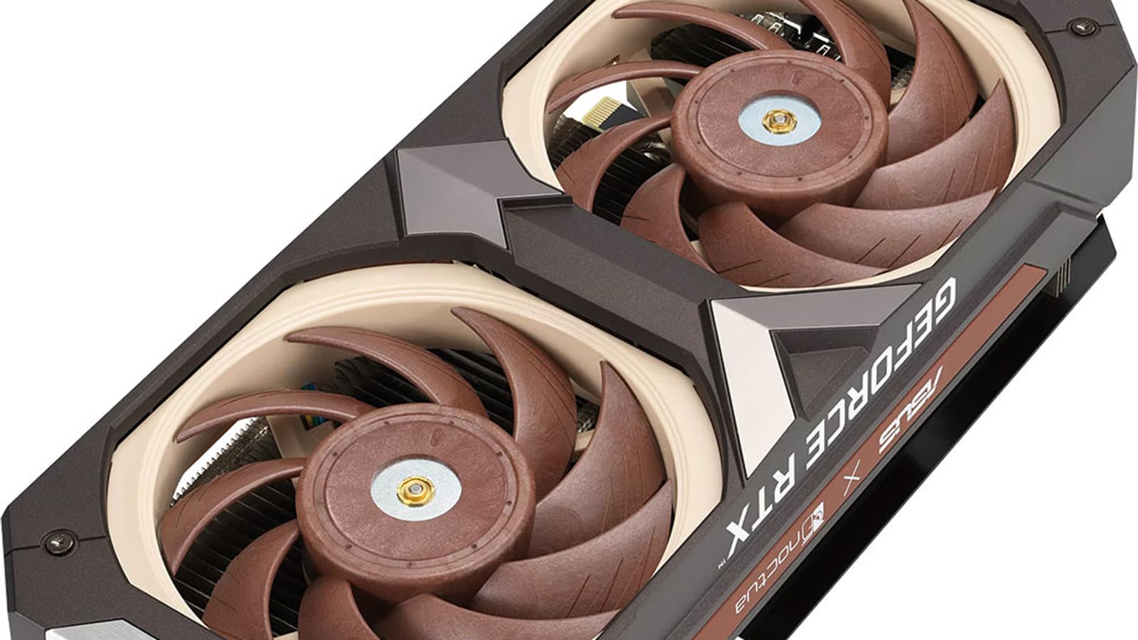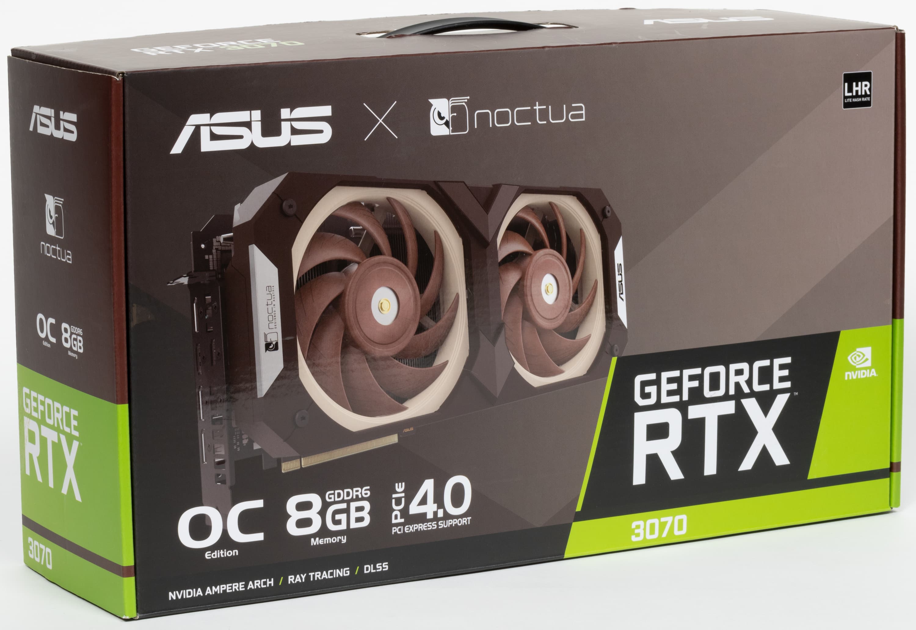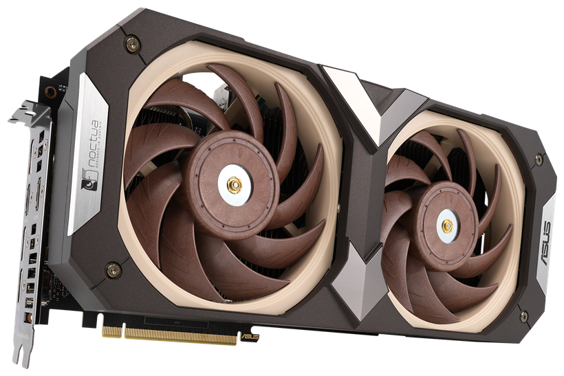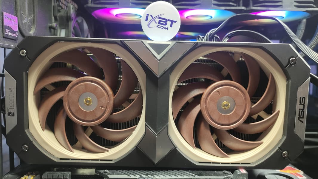 У видеокарты Asus GeForce RTX 3070 Noctua OC Edition отсутствует подсветка, но она тут и не нужна. Стиль и расцветка лопастей вентиляторов — вполне достаточный отличительный признак, эту карту и так ни с чем не спутаешь.