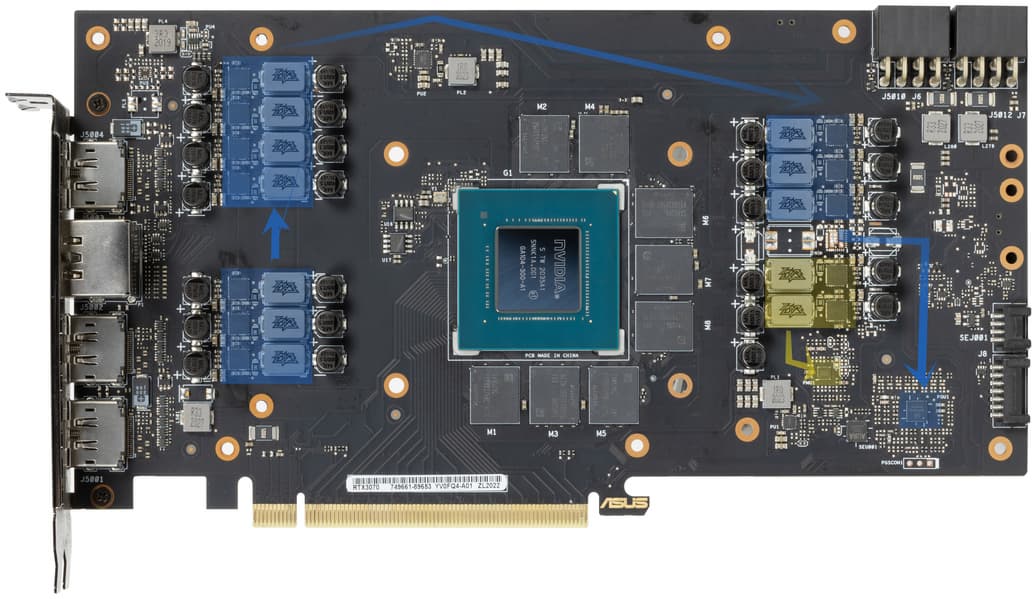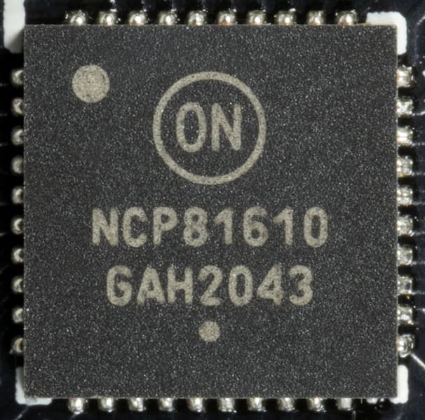 Синим цветов отмечены фазы питания графического процессора (ГП), а желтым — памяти. Для управления схемой питания ядра используется ШИМ-контроллер NCP81610 (On Semiconductor), расположенный на лицевой стороне платы. Слева от ГП расположены 7 фаз и справа 3 фазы питания ядра.