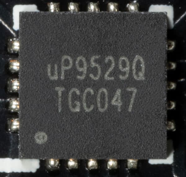 На той же стороне имеется ШИМ-контроллер uP9529Q (uPI Semiconductor), который управляет двухфазной схемой питания микросхем памяти.