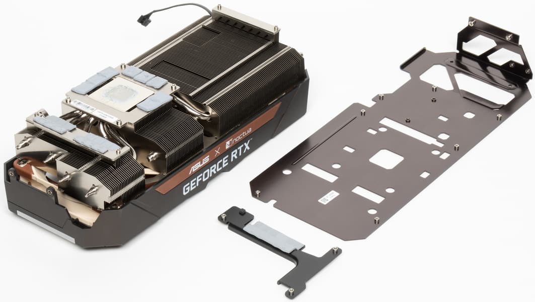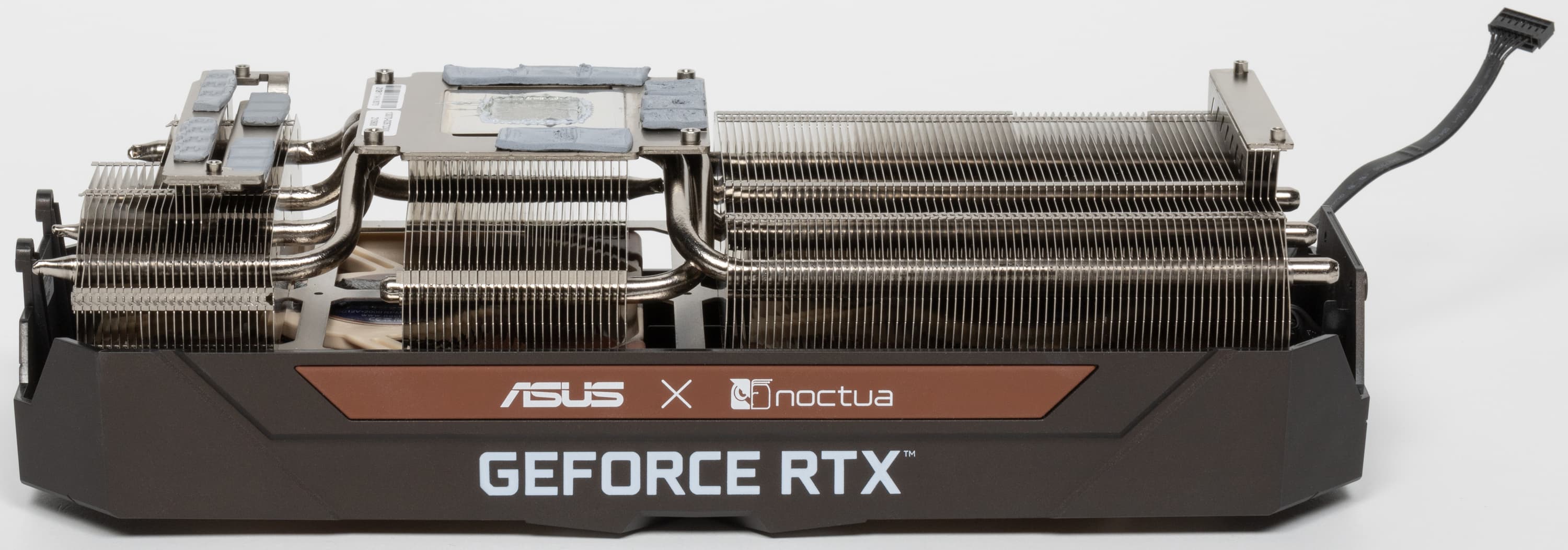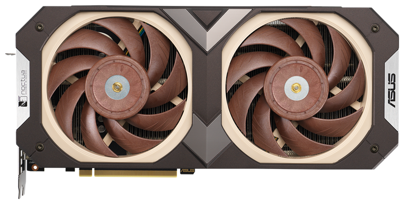 Перед нами огромная видеокарта весом почти 1,6 кг, занимающая 4 слота расширения. Ее система охлаждения представляет собой конструкцию из увеличенного относительно модели TUF Gaming радиатора и пары самых эффективных и самых тихих в мире вентиляторов Noctua — NF-A12x25 PWM.