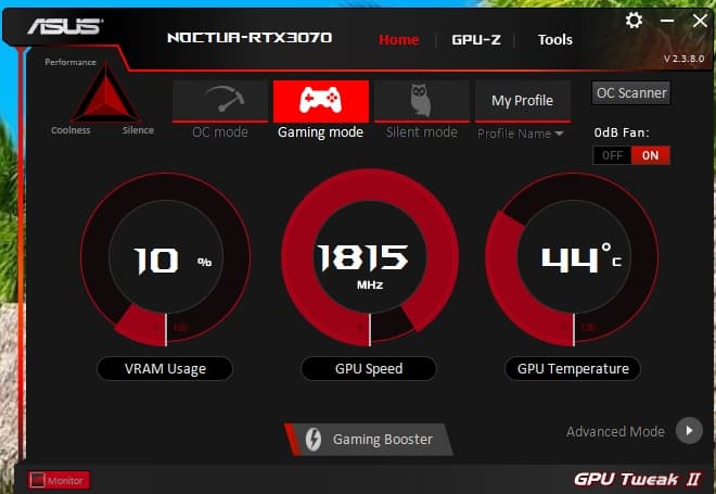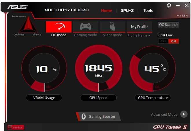 Для выставления OC Mode следует скачать утилиту Asus GPU Tweak II с сайта производителя. Она также позволяет управлять ручным разгоном и наблюдать за параметрами карты.