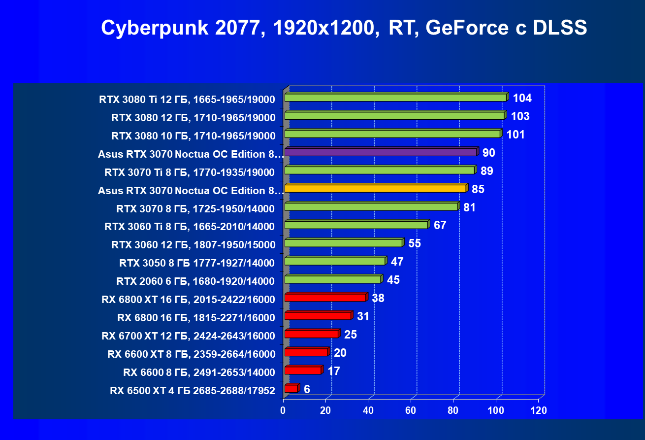 | 09 | Asus RTX 3070 Noctua 8 ГБ, 1845—1965/14000 | 590 |