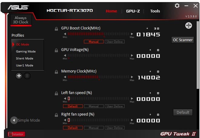 | Режим работы | Asus GeForce RTX 3070 Noctua OC Edition | Asus TUF Gaming GeForce RTX 3070 OC Edition |