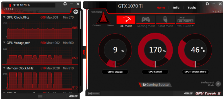 При этом обеспечивается очень гибкое регулирование напряжений на ядре с ювелирной точностью с помощью фирменной утилиты Asus GPU Tweak II, которая поставляется с картой на диске, а также ее можно скачать с сайта производителя. Программа позволяет автоматически настроить работу ускорителя на максимально возможные частоты (если владелец не желает самостоятельно искать достижимый максимум). Эта же утилита управляет подсветкой системы охлаждения, и можно настроить как цветовую гамму, так и реакцию подсветки на события (нагрев карты, воспроизведение музыки и т. д.).