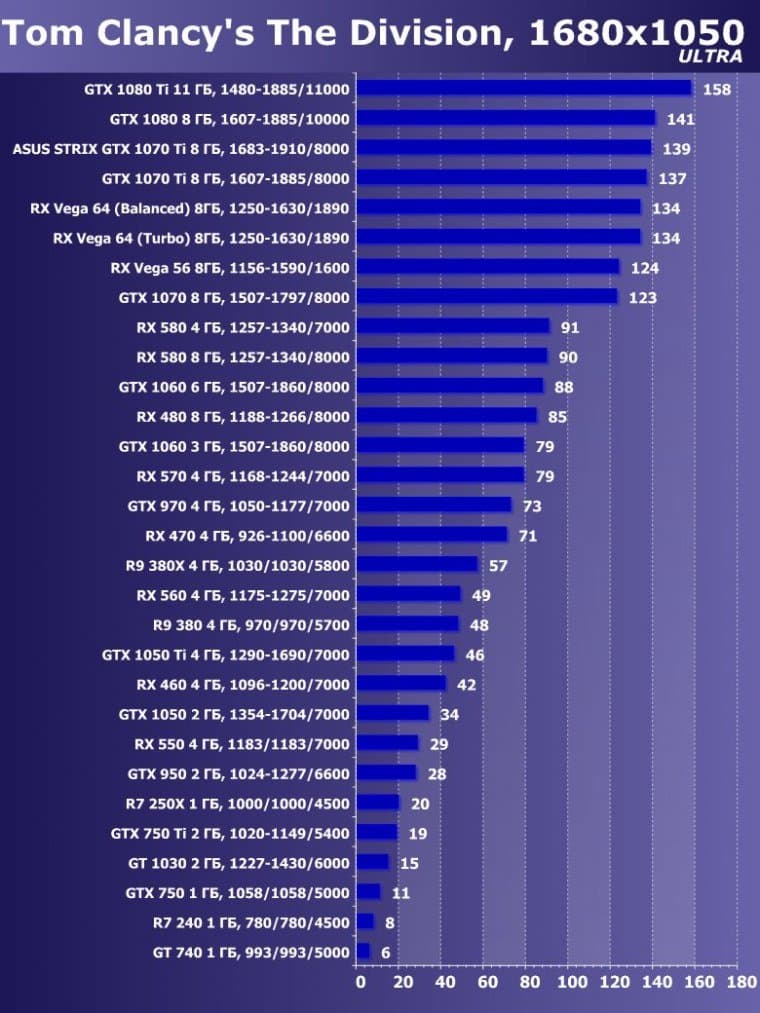 | 15 | GTX 1070 Ti 8 ГБ, 1607—1885/8000 | 595 | 2260 | 38 000 |