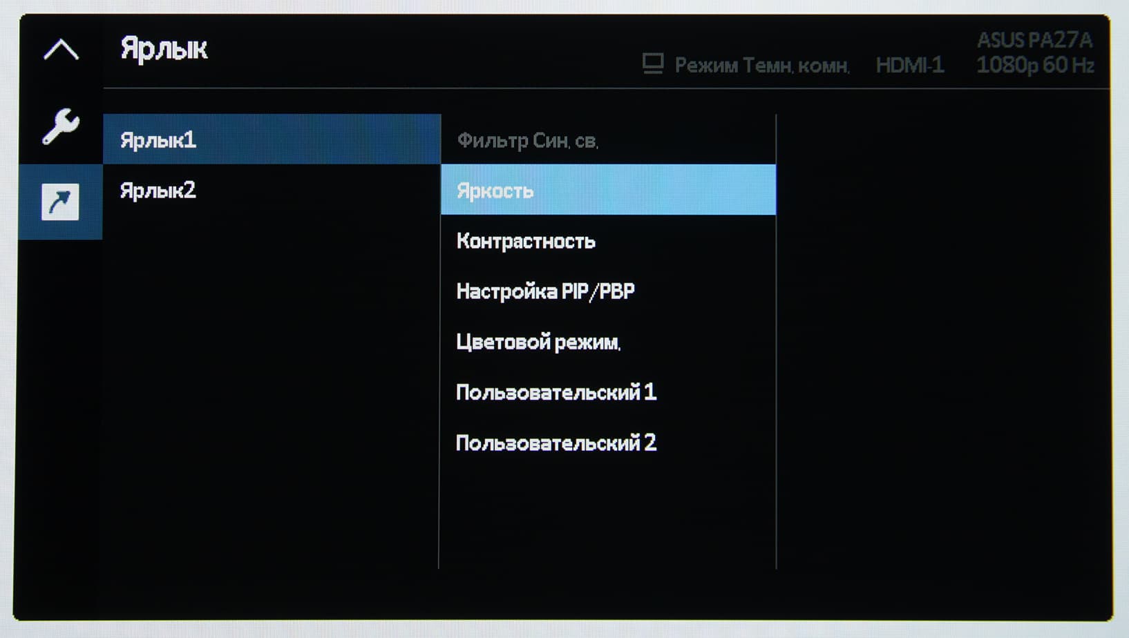 По умолчанию это регулировка яркости и снижение интенсивности синей компоненты. Также в коротком меню есть выбор входа, и вывод на экран сеток-шаблонов QuickFit (сетка для выравнивания, рамки A4 и B5 в ландшафтной и портретной ориентации с возможностью перемещения, рамка в формате пользователя, метрическая и дюймовая линейка). Пункт выхода из короткого меню по ошибке переведен как «близко», а первая строчка (нажатие на джойстик) — это вход в основное меню. Основное меню относительно большое. При настройке изображения меню остается на экране, что немного мешает оценке вносимых корректировок. Настраивается прозрачность фона и задержка автоматического выхода из меню. Есть возможность заблокировать все кнопки. Меню может автоматически менять ориентацию при перевороте экрана в портретный режим. Присутствует русская версия экранного меню.