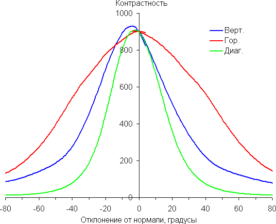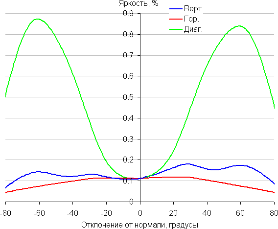 Отметим плавное уменьшение яркости при отклонении от перпендикуляра к экрану в горизонтальном направлении, при этом графики не пересекаются во всем диапазоне измеряемых углов. Чуть быстрее падает яркость при отклонении в вертикальном направлении. При отклонении в диагональном направлении поведение яркости оттенков имеет промежуточный характер между вертикальным и горизонтальным направлениями, за исключением яркости черного поля, которая начинает резко возрастать уже при 20°-30° отклонения от перпендикуляра к экрану. Если сидеть от экрана на расстоянии 50-60 см, то черное поле по углам будет заметно светлее, чем в центре. Контрастность в диапазоне углов ±82° в случае отклонения по диагонали приближается к отметке 10:1, но не опускается ниже.