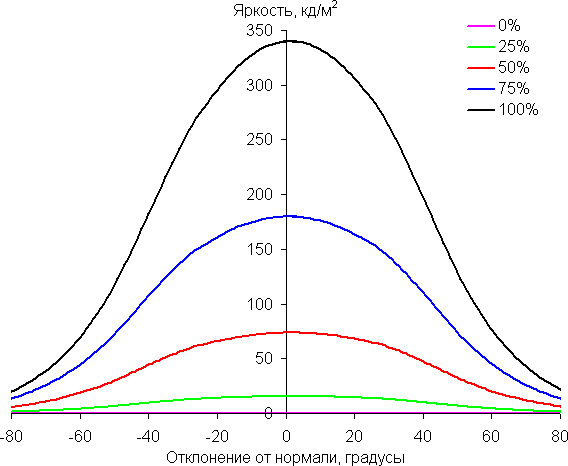 В качестве реперной точки можно выбрать отклонение в 45°, что может быть актуальным в случае, например, если изображение на экране рассматривают два человека одновременно. Критерием сохранения правильности цветов можно считать значение ΔE меньше 3. Стабильность цветов хорошая, это является одним из главных достоинств матрицы типа IPS.