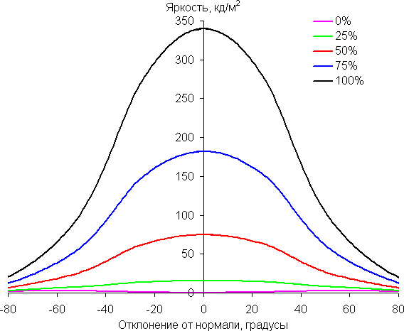Чтобы выяснить, как меняется яркость экрана при отклонении от перпендикуляра к экрану, мы провели серию измерений яркости черного, белого и оттенков серого в центре экрана в широком диапазоне углов, отклоняя ось датчика в вертикальном, горизонтальном и диагональном (из угла в угол) направлениях.