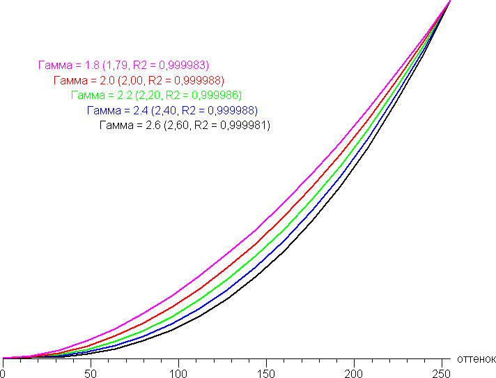 Реальная гамма-кривая зависит от выбранного профиля в списке Гамма (значения показателей аппроксимирующей функции приведены в скобках в подписях, там же — коэффициент детерминации):