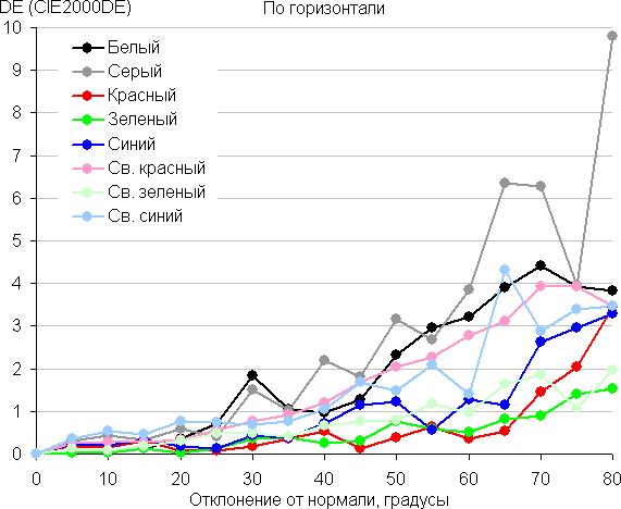 Для количественной характеристики изменения цветопередачи мы провели колориметрические измерения для белого, серого (127, 127, 127), красного, зеленого и синего, а также светло-красного, светло-зеленого и светло-синего полей во весь экран с использованием установки, подобной той, что применялась в предыдущем тесте. Измерения проводились в диапазоне углов от 0° (датчик направлен перпендикулярно к экрану) до 80° с шагом в 5°. Полученные значения интенсивностей были пересчитаны в ΔE относительно замера каждого поля при перпендикулярном положении датчика относительно экрана. Результаты представлены ниже: