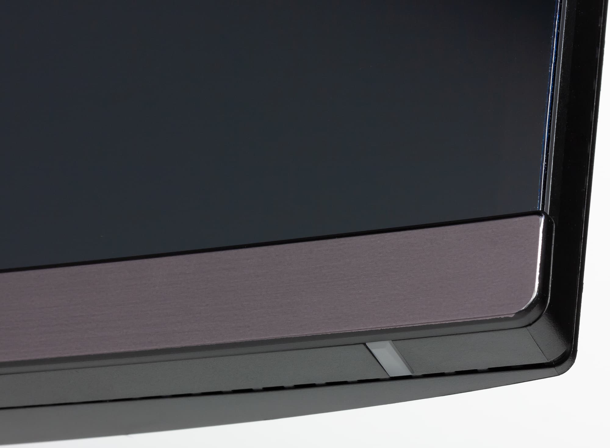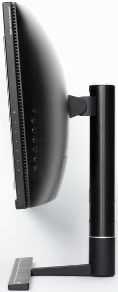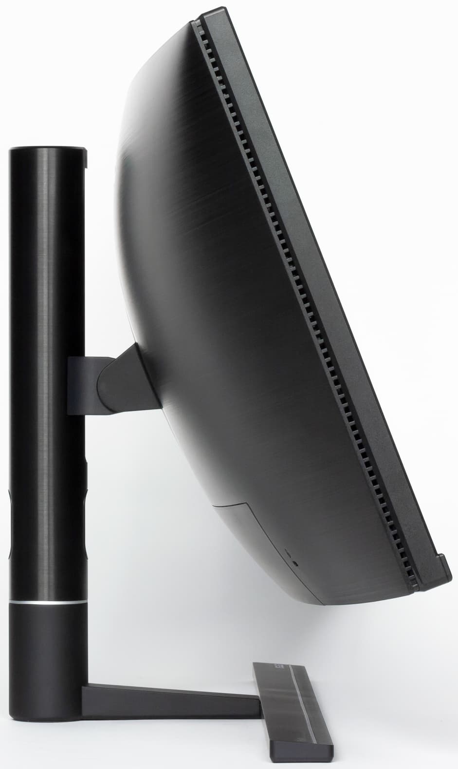 Плоскость экрана изогнута по цилиндру так, что правый и левый край немного выдвинуты вперед. Заявленный радиус изгиба равен 1,9 м. Равномерность кривизны экрана у данной модели хорошая. Фронтальная поверхность экрана выглядит как монолитная поверхность, ограниченная снизу относительно узкой рамкой, а по периметру — узкой окантовкой. Выведя изображение на экран, можно увидеть, что на самом деле между внешними границами экрана и собственно областью отображения есть неширокие поля. Внешние панели блока экрана и кожухи подставки изготовлены из черного пластика в основном с немаркой матовой поверхностью. На задней панели на большей части площади есть мелкий рельеф в виде горизонтальных канавок, а кольцевая область по центру — с зеркально-гладкой поверхностью. Логотип на задней панели — это наклейка из пластика с зеркально-гладким металлизированным слоем.