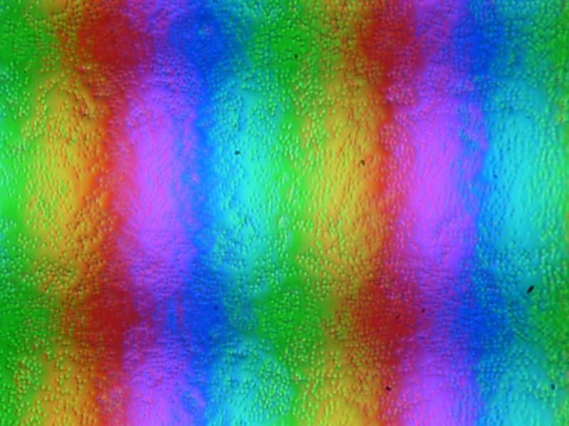 Зерно этих дефектов в несколько раз меньше размеров субпикселей (масштаб этих двух фотографий примерно одинаковый), поэтому фокусировка на микродефектах и «перескок» фокуса по субпикселям при изменении угла зрения выражены слабо, из-за этого нет и «кристаллического» эффекта.