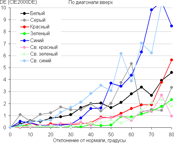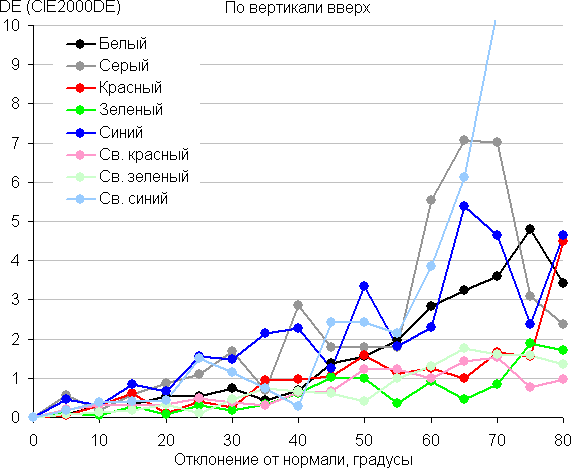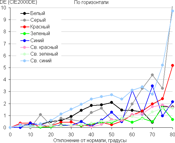 Для количественной характеристики изменения цветопередачи мы провели колориметрические измерения для белого, серого (127, 127, 127), красного, зеленого и синего, а также светло-красного, светло-зеленого и светло-синего полей во весь экран с использованием установки, подобной той, что применялась в предыдущем тесте. Измерения проводились в диапазоне углов от 0° (датчик направлен перпендикулярно к экрану) до 80° с шагом в 5°. Полученные значения интенсивностей были пересчитаны в ΔE относительно замера каждого поля при перпендикулярном положении датчика относительно экрана. Результаты представлены ниже: