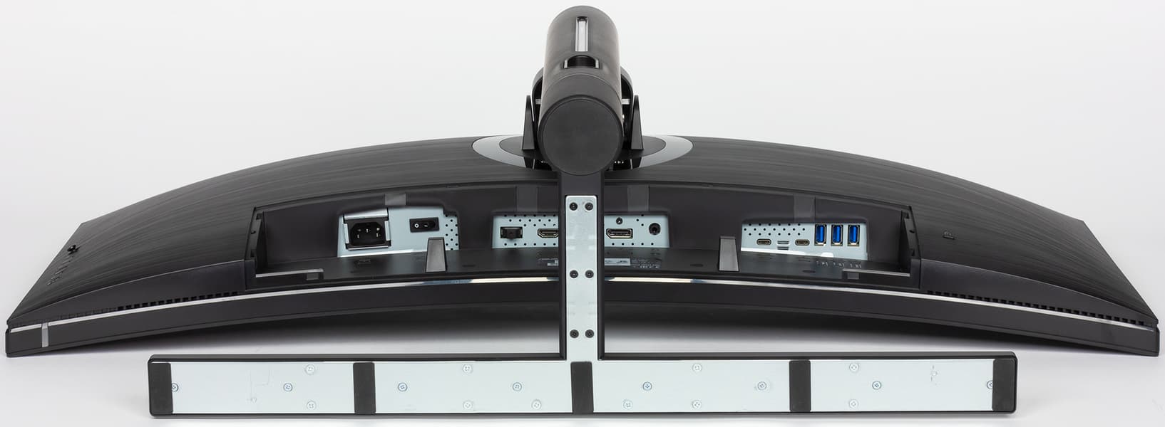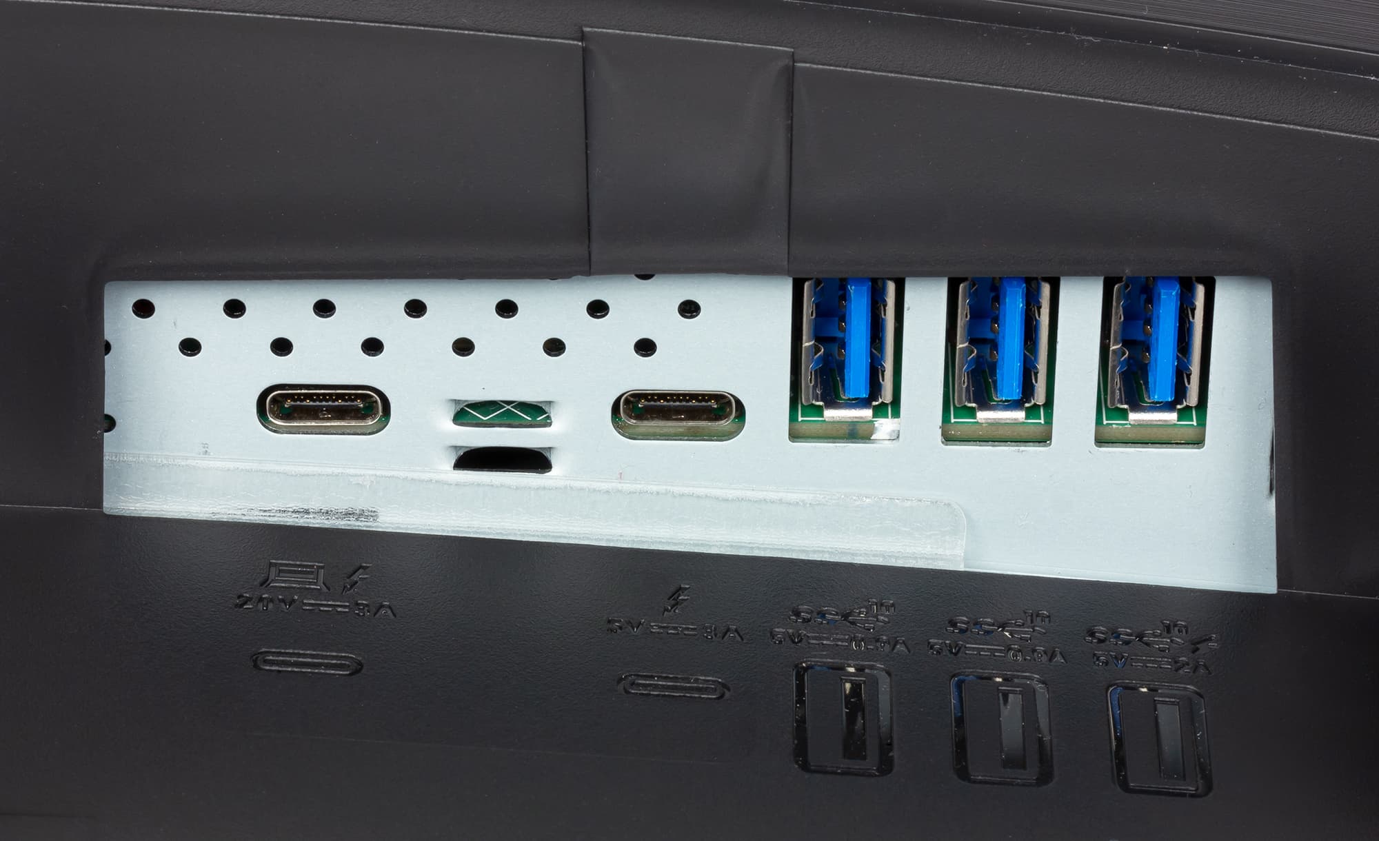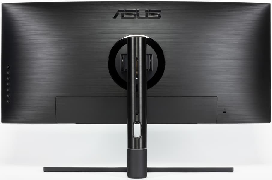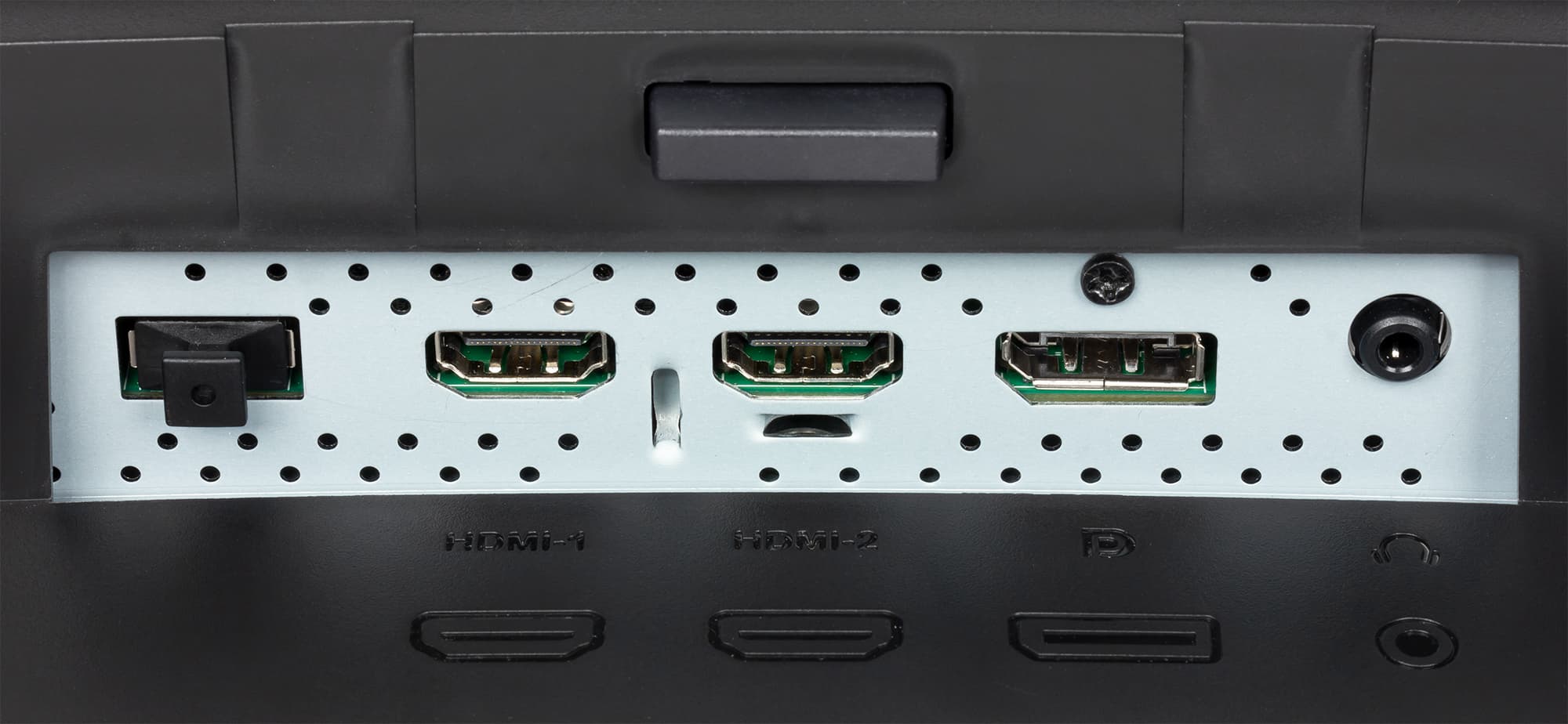 Все интерфейсные разъемы и разъем питания расположены в нише на задней панели и ориентированы вниз. Рядом с разъемом питания — механический выключатель питания. Подключать кабели к монитору не очень удобно. Также на задней панели можно обнаружить разъем для кенсингтонского замка.